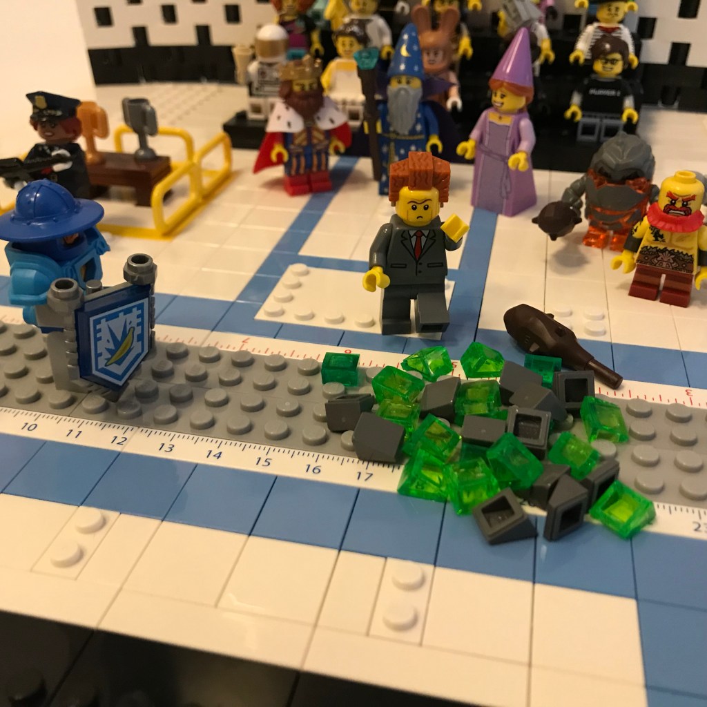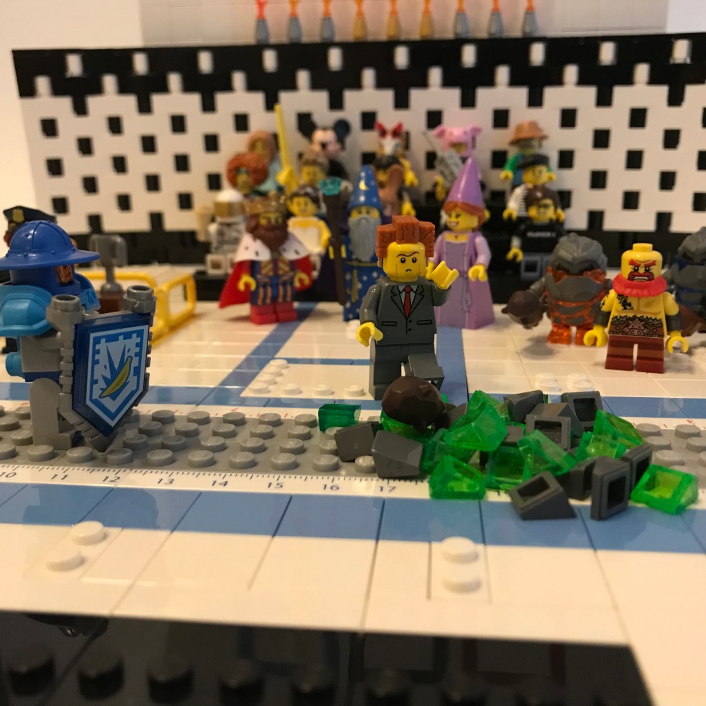 At the ref’s cry of “Fence!” the rock monster surges forward, while the Knight of the Banana Peel stands his ground, remaining perfectly still.