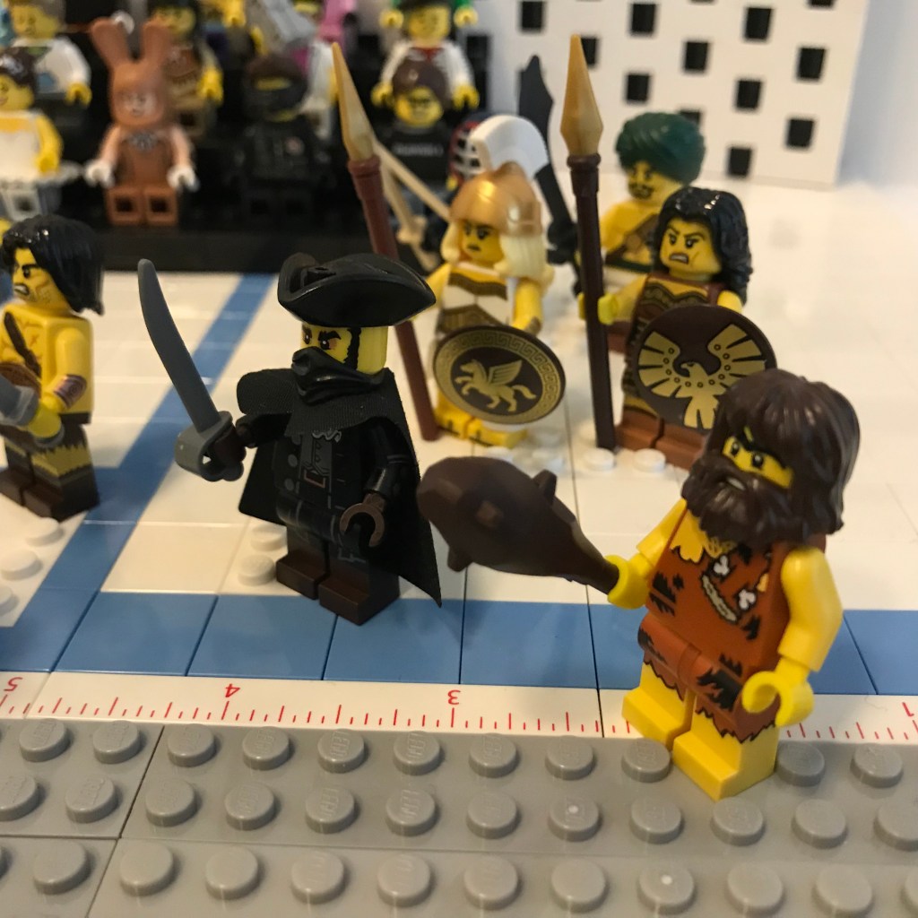 Behind Captain Hook come the rest of Yestermorrow, representing many different cultures and periods in our history, all the way back to our club-wielding, cave-dwelling ancestors. I see some very well-known figures, Barbara: with Captain Hook is another well-known pirate – ahem, privateer – Captain William Kidd and the equally famous duelist Inigo Montoya!
