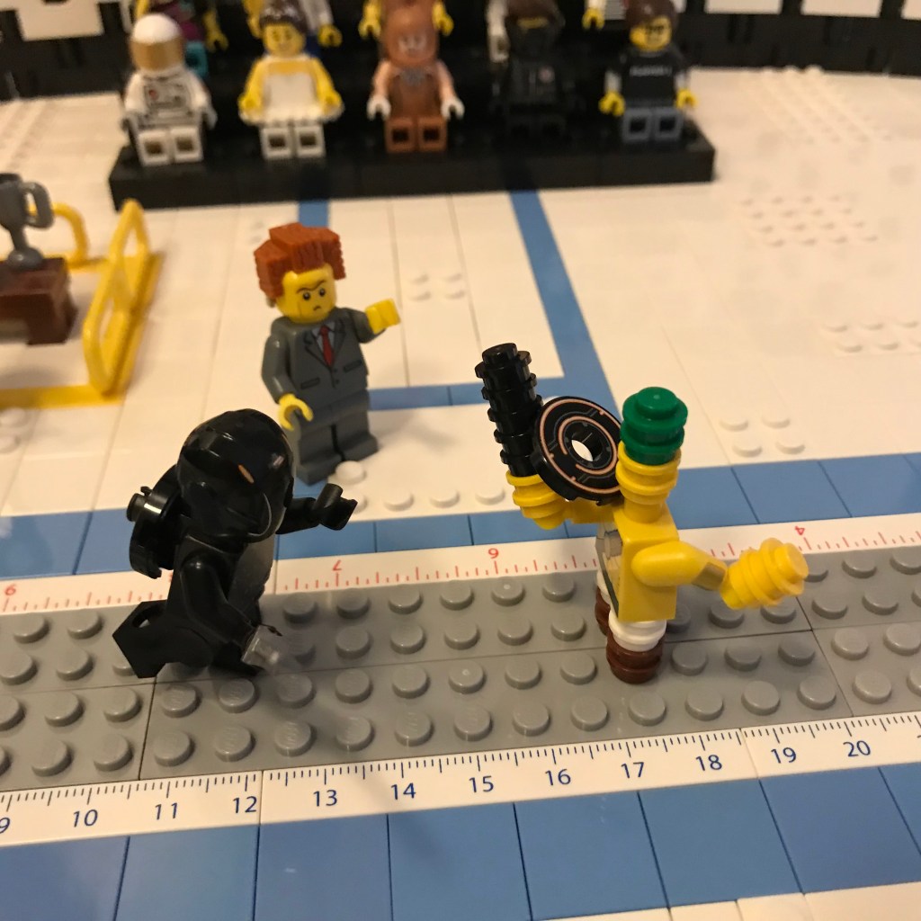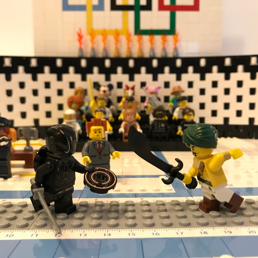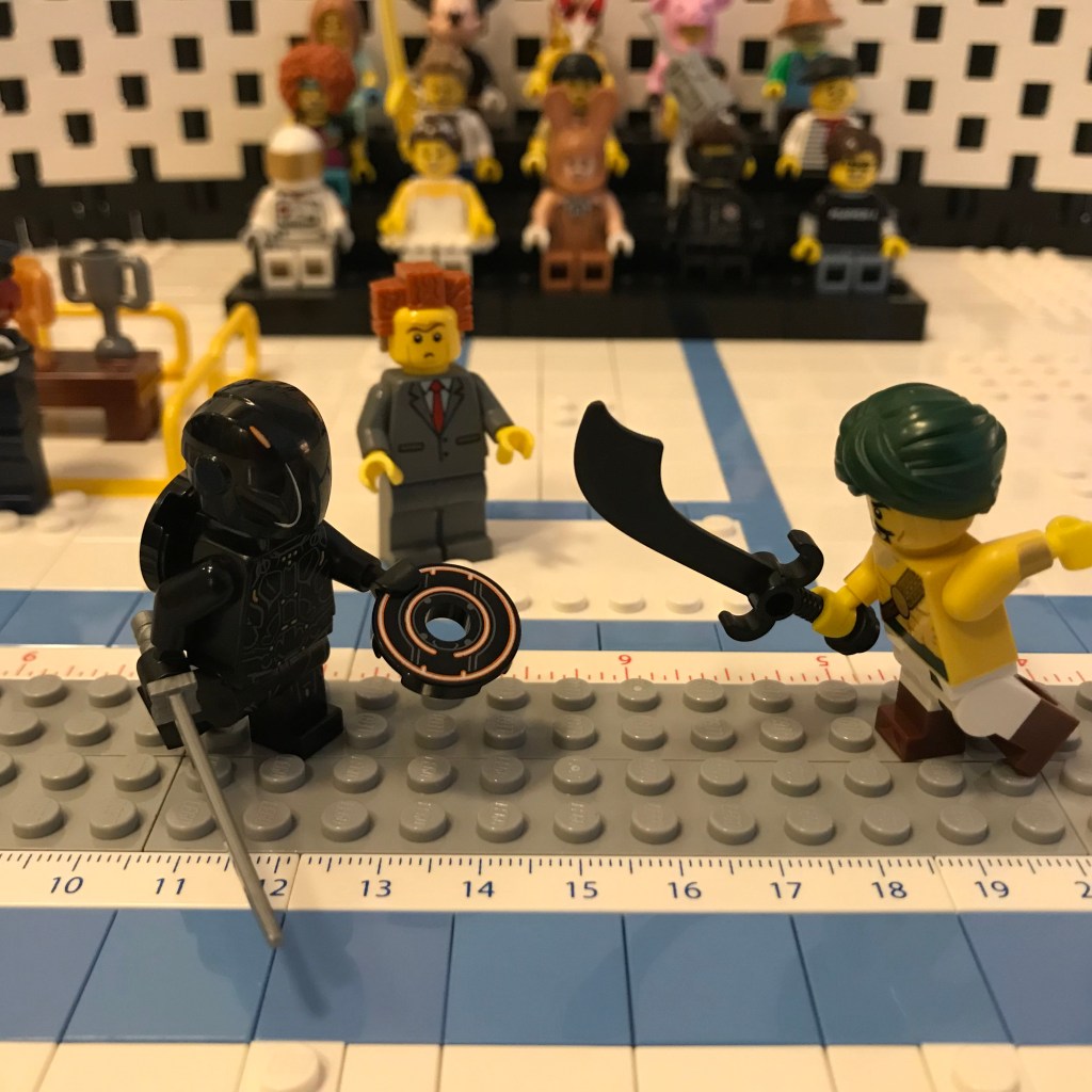 There you have it folks! Rinzler in the flesh – or not, I suppose. It looks like both Referee Bidness and Saladin, first up from the Yestermorrow team, are not very happy about having a Light Cycle at the en garde line. But Rinzler has deferred to the ref and set his Light Cycle aside.