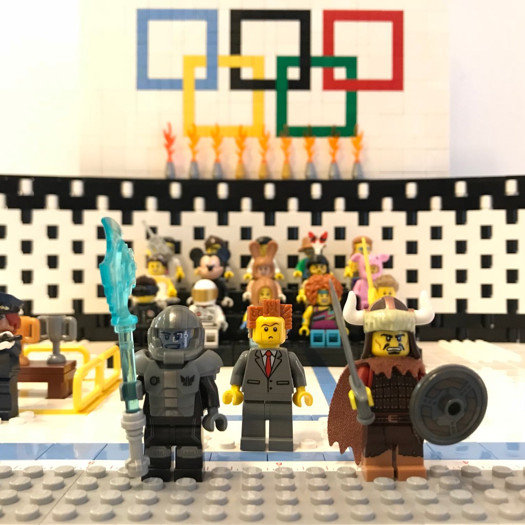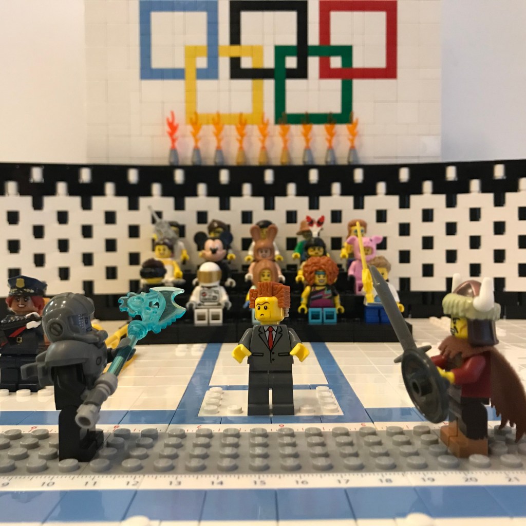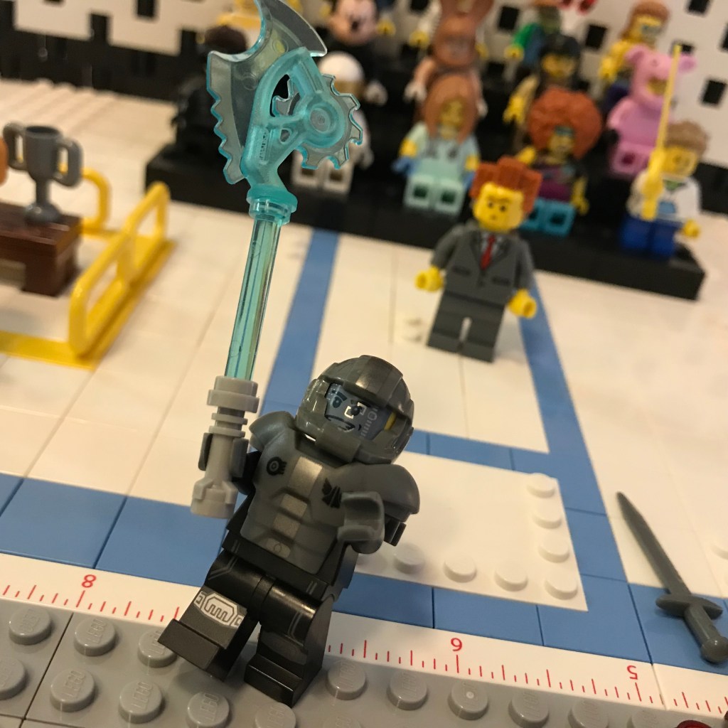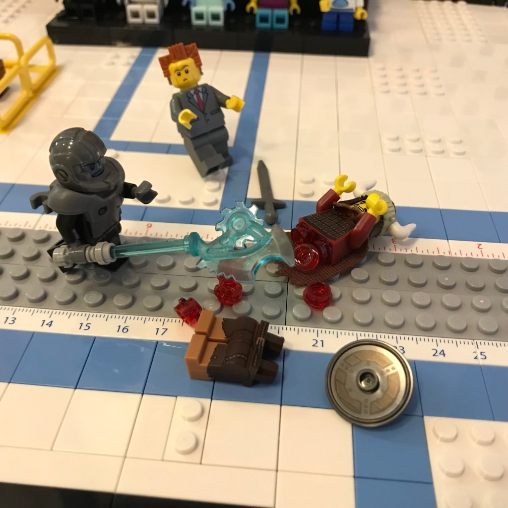 Okay, Barbara, we’re back now, and things are calmer in Salle du Brique. The Tyrannosaurus has been lured away, courtesy of our sponsor Hot Dog on Rollerskates and their generous donation of several megakilos of processed meat. Bunny Squibb’s Exo Suit is safely in impound, and the doctors think our brave security officers are going to pull through. Both Bunny Squibb and Bert Beatstick have been disqualified.