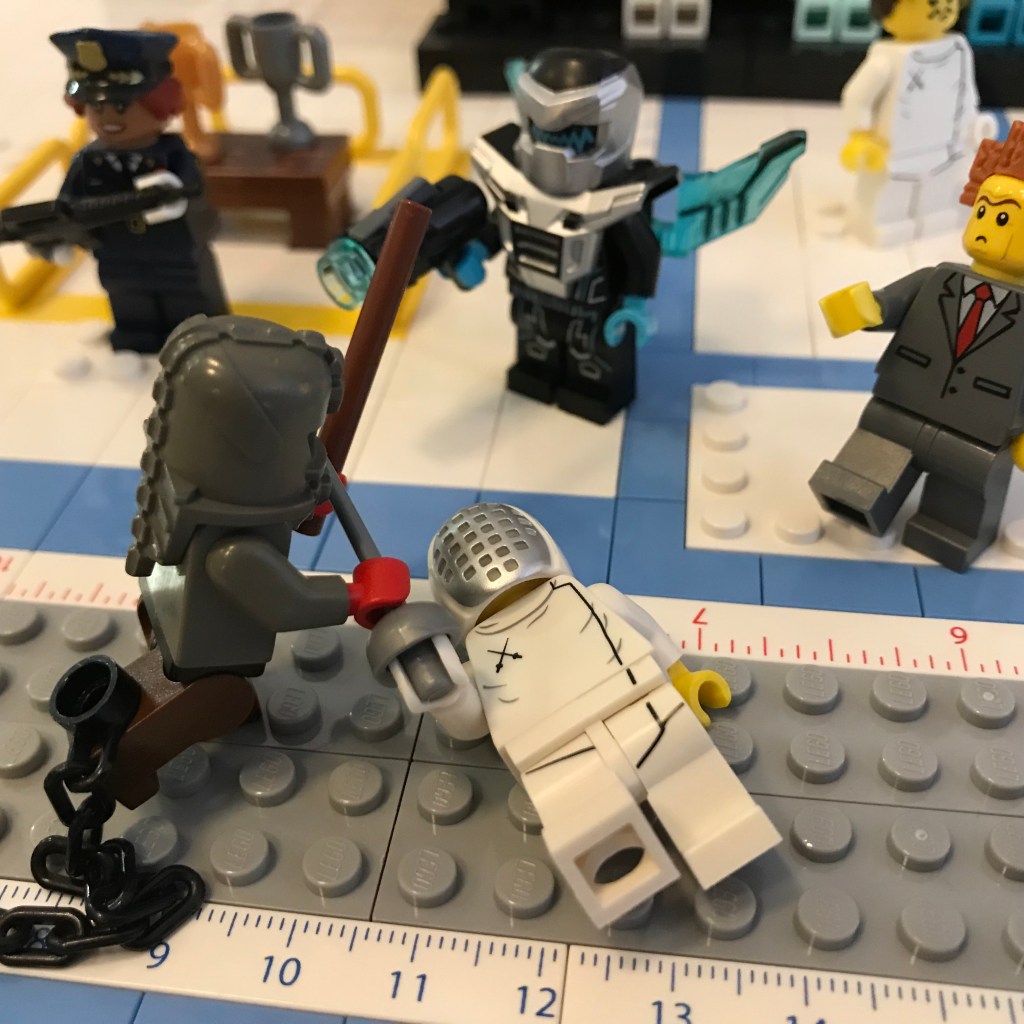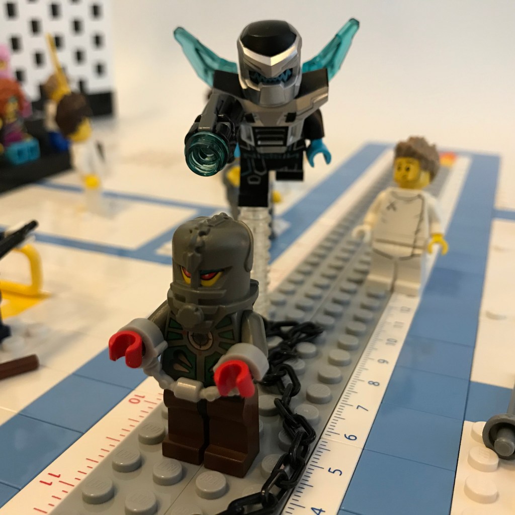 Here comes the robot guard and – yes, there’s the iron helmet and shackles. I think we know now why the guards keep her face covered this way.