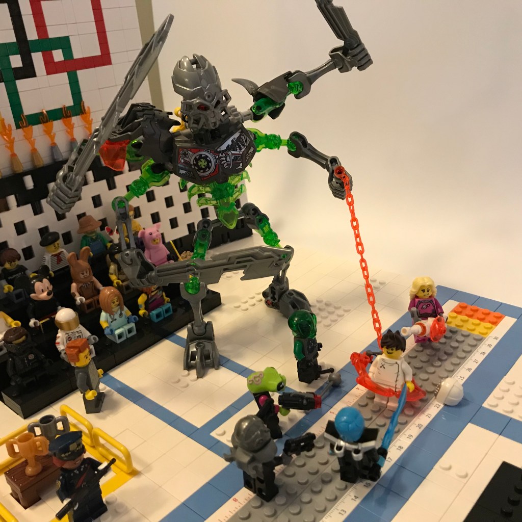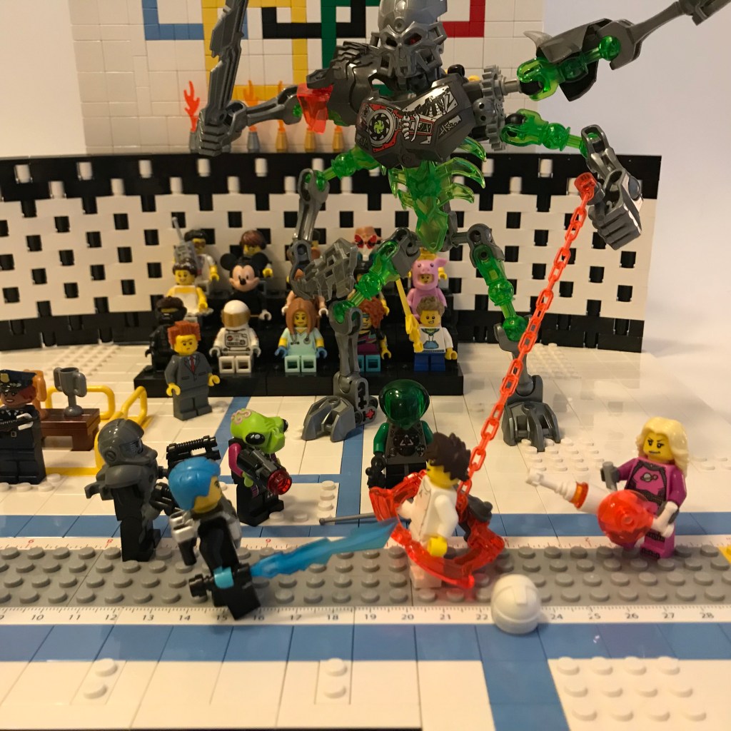 Before the referee can even start the bout, suddenly the whole BlueShift team is on the piste – including that monstrous giant robot!