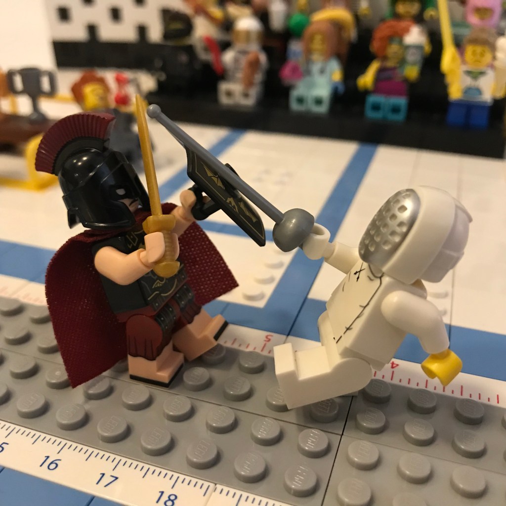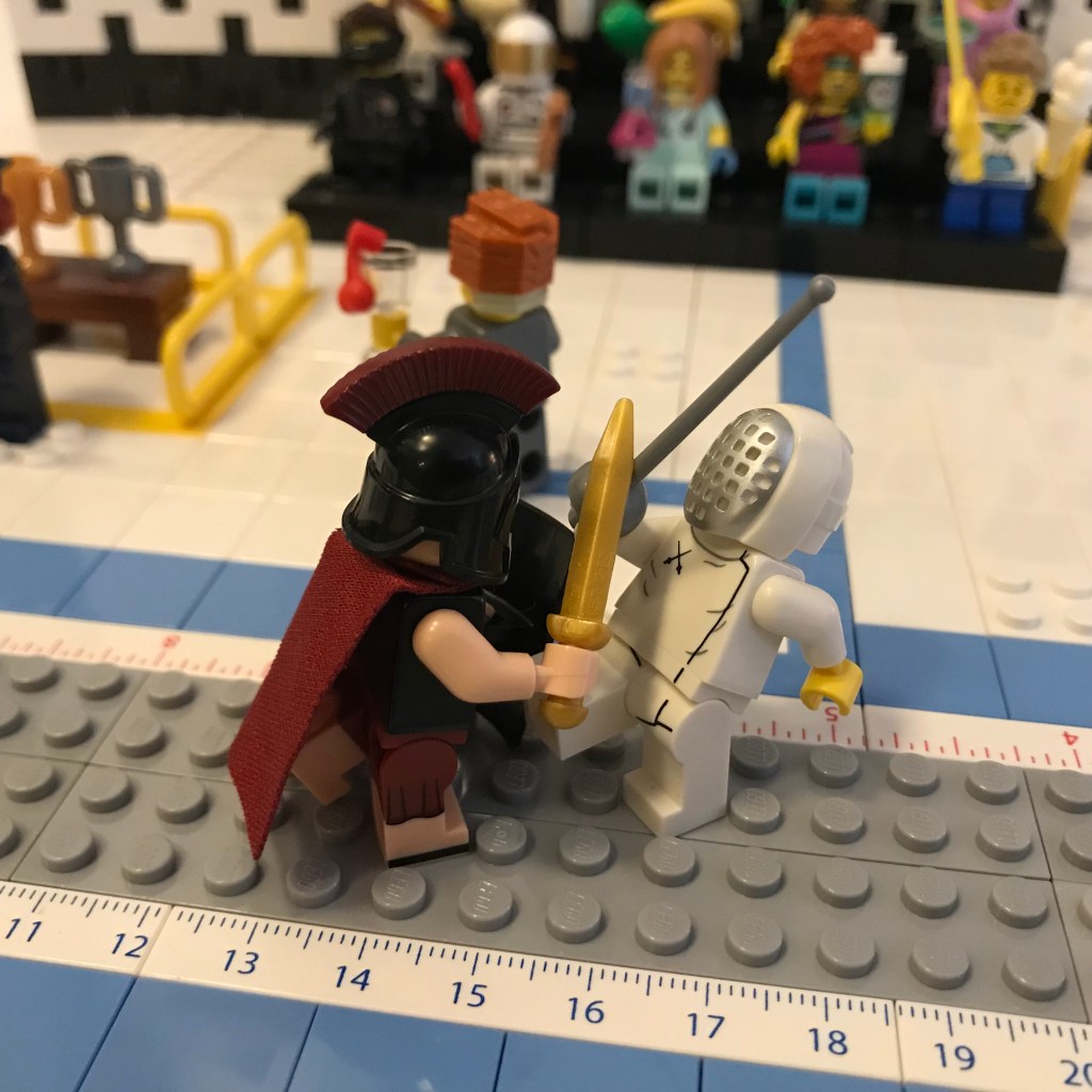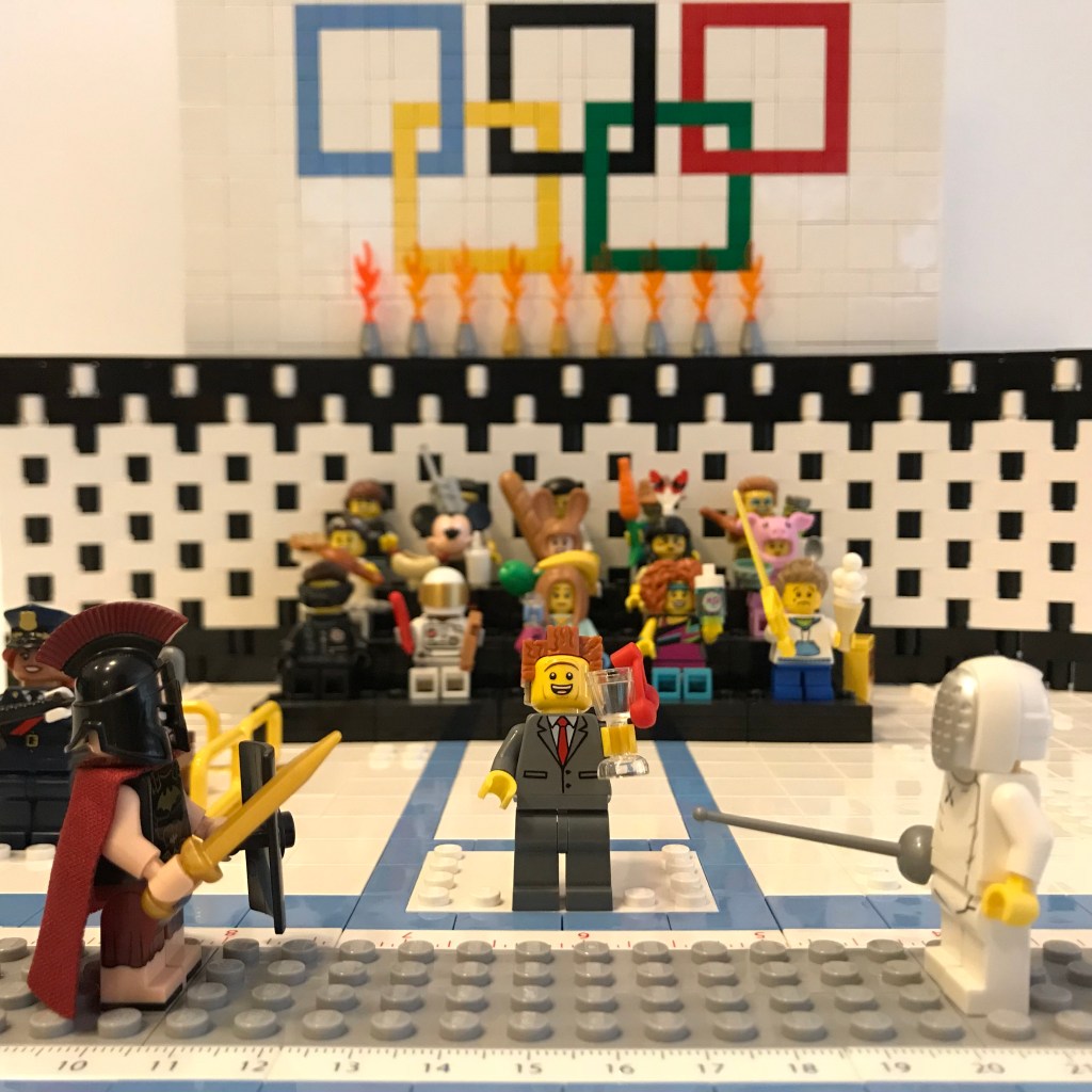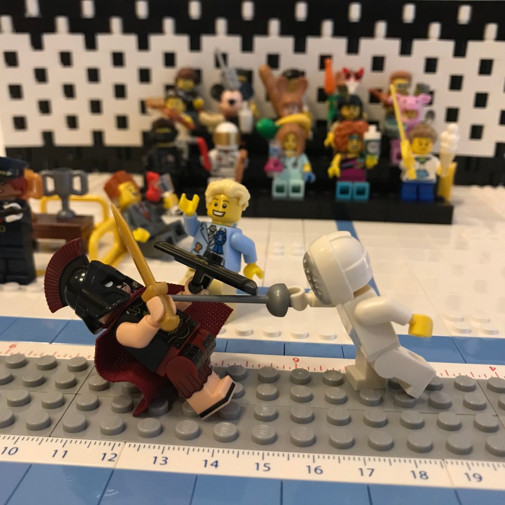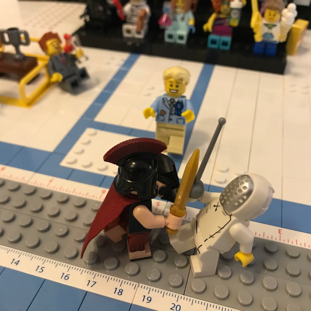 Good Lord, let’s try this again. Okay, the fencers on the on the en garde line. Referee Bidness still has his martini; that’s concerning.