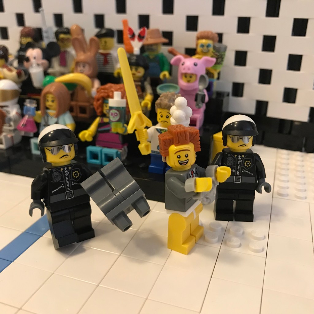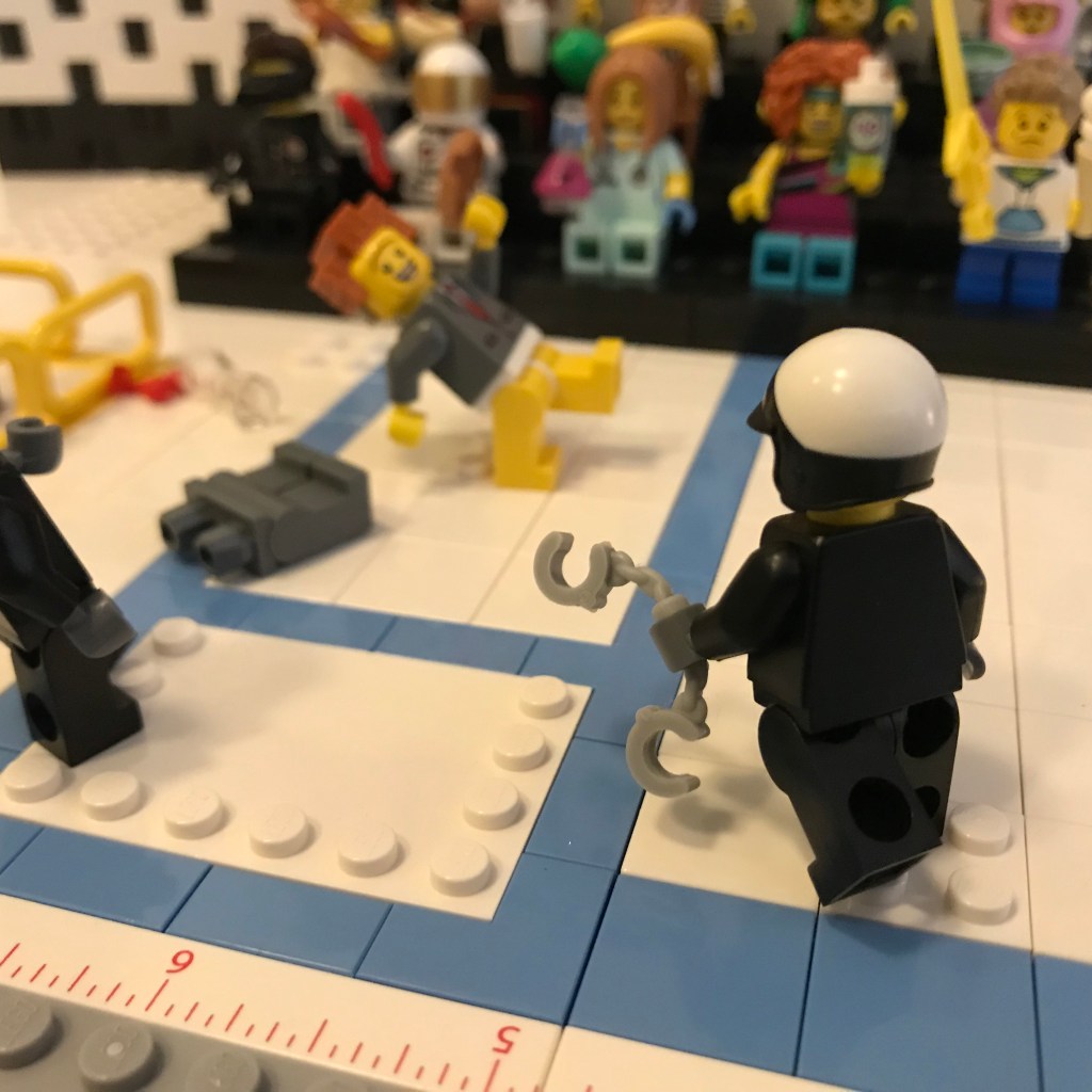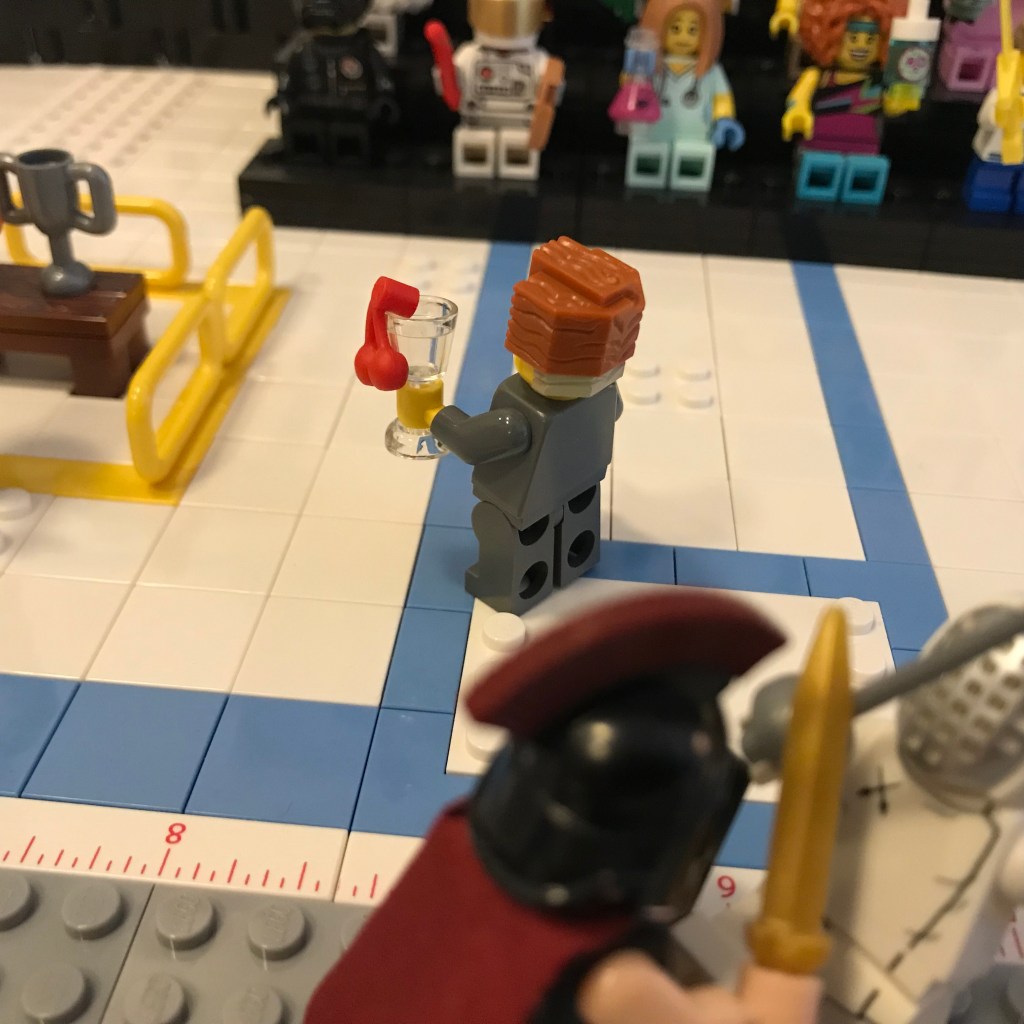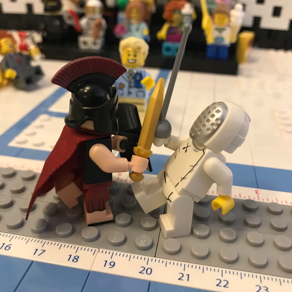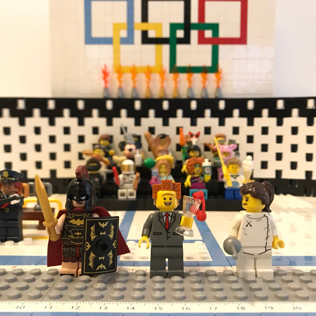 Good Lord, let’s try this again. Okay, the fencers on the on the en garde line. Referee Bidness still has his martini; that’s concerning.