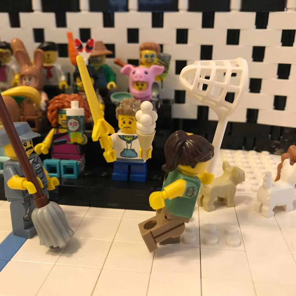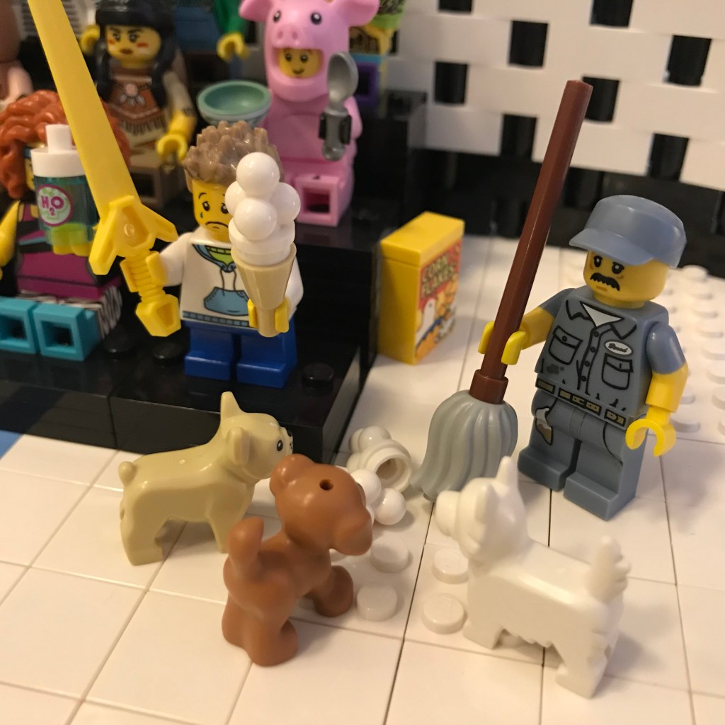 Okay, here we go – wait a minute! More commotion from the stands! There’s a bunch of … stray dogs in the hall? They’re fighting over the ice cream.