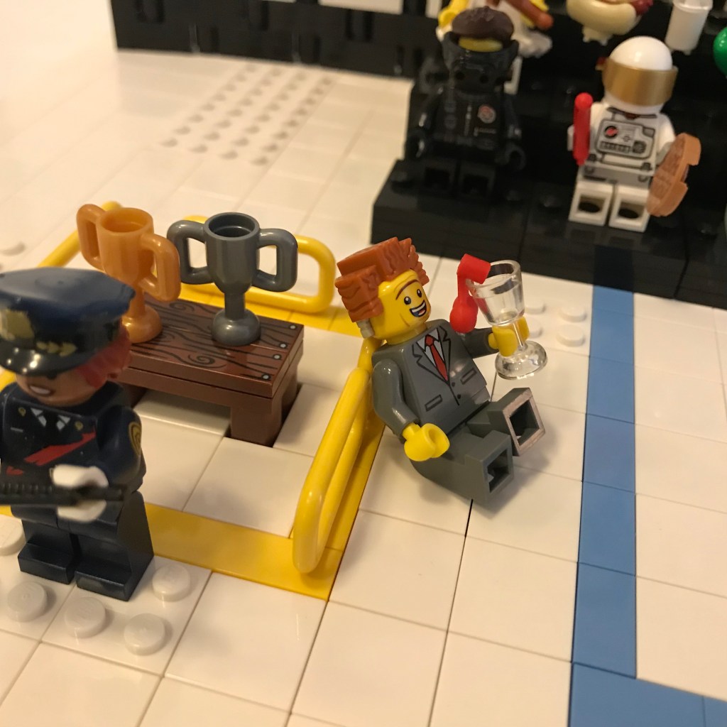Referee Bidness is slumped against a safety guard and appears to be giggling to himself. I think that martini really got to him! Keep filming, Barbara, I’m going to jump in and referee!