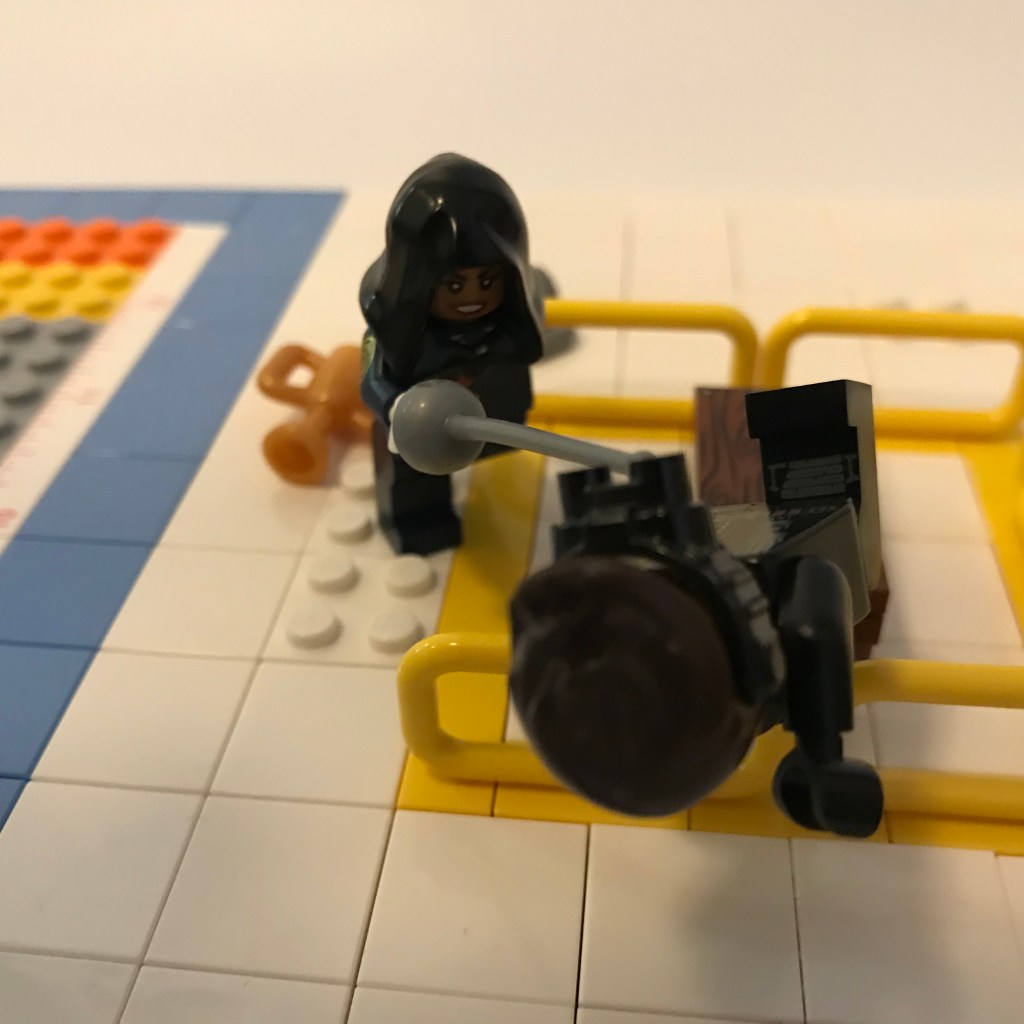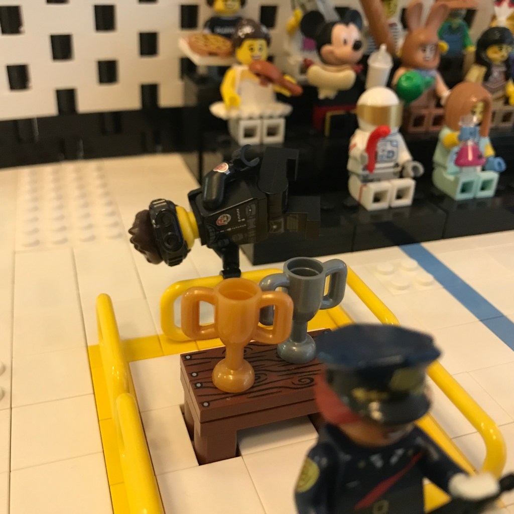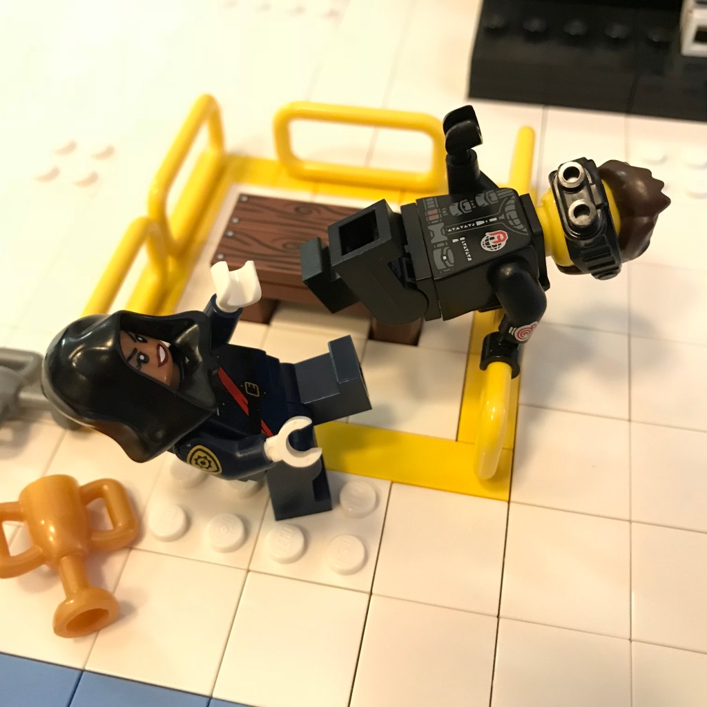 Ready – wait a minute! Barbara, a man in black has just leapt from the audience and vaulted the barriers around the trophies! He’s trying to steal them! Officer Barbara Gordon isn’t having it; she dives in and receives a kick to the face! There goes her hat and – her wig? That’s not her real hair! She’s wearing a hijab under the wig – Barbara, is that – can it be? My eyes must be deceiving me!