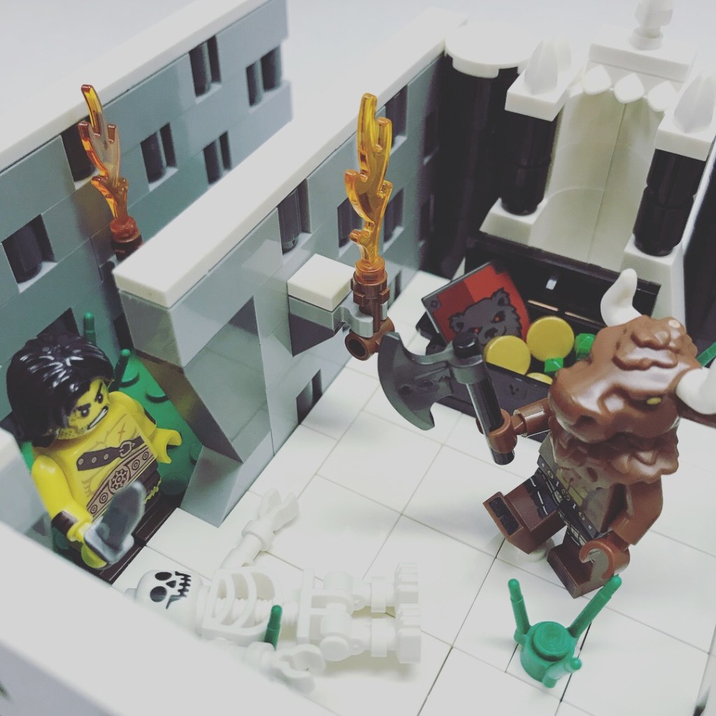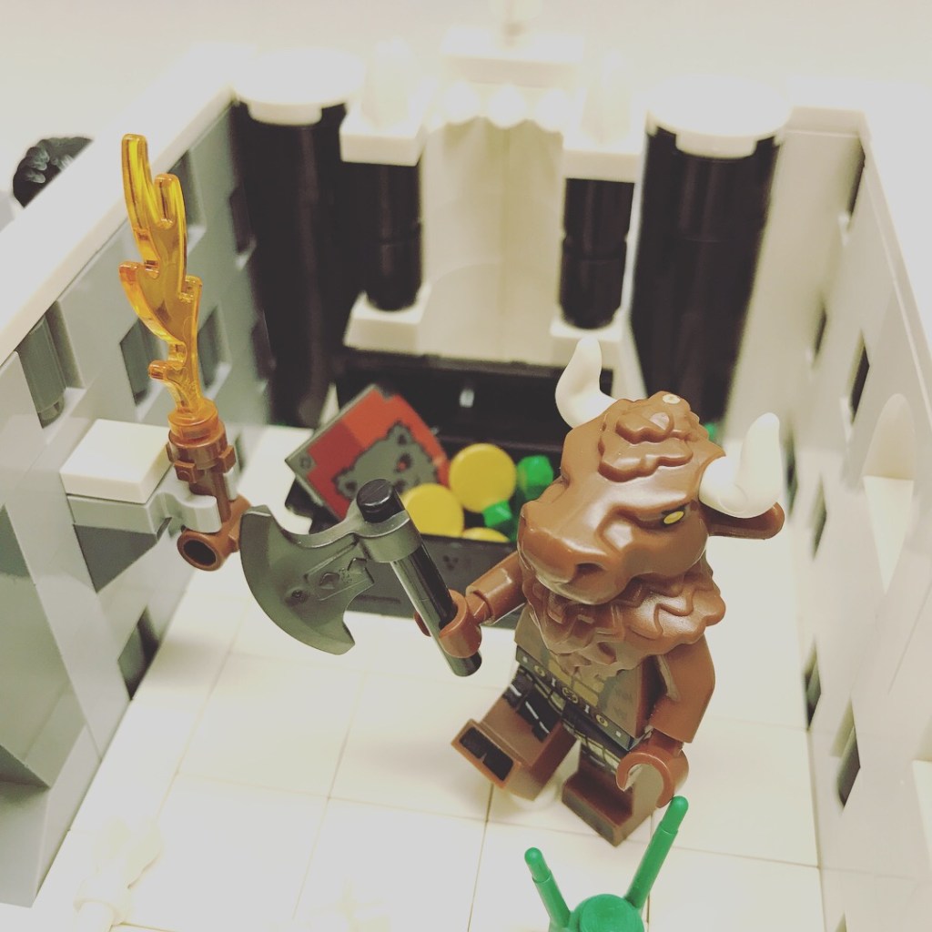There’s a barbarian, some dead guy, a minotaur with an axe, and some sweet-looking treasure.