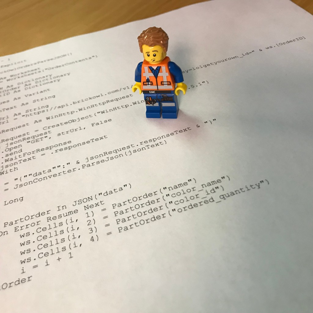 I’m self-taught, which means I’m mostly making it up as I go along. I buys a lot of Lego on BrickOwl and had always dreamed of having an Access database of all my parts. Last night I dreamed I was teaching myself to use VBA to parse the JSON result of an API call. Turns out every Lego part has between three and eight different ID numbers, all of which the API returns in a single object with identical field names, so the code needs some kinda recursive logic? Maybe? Why are there so many ID fields? What the hell does “subscript out of range” mean? Why did I spend so much money on plastic? How am I going to afford retirement? This sucks.