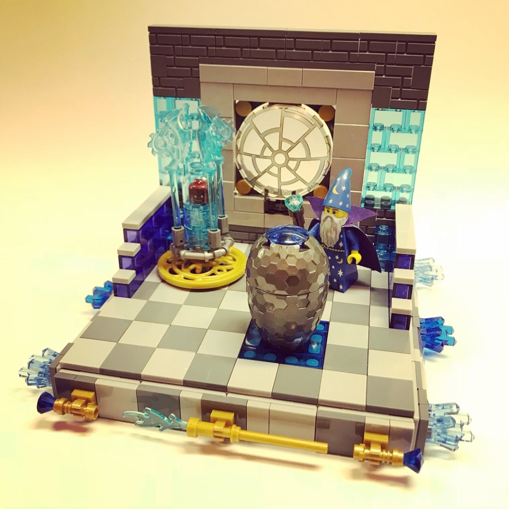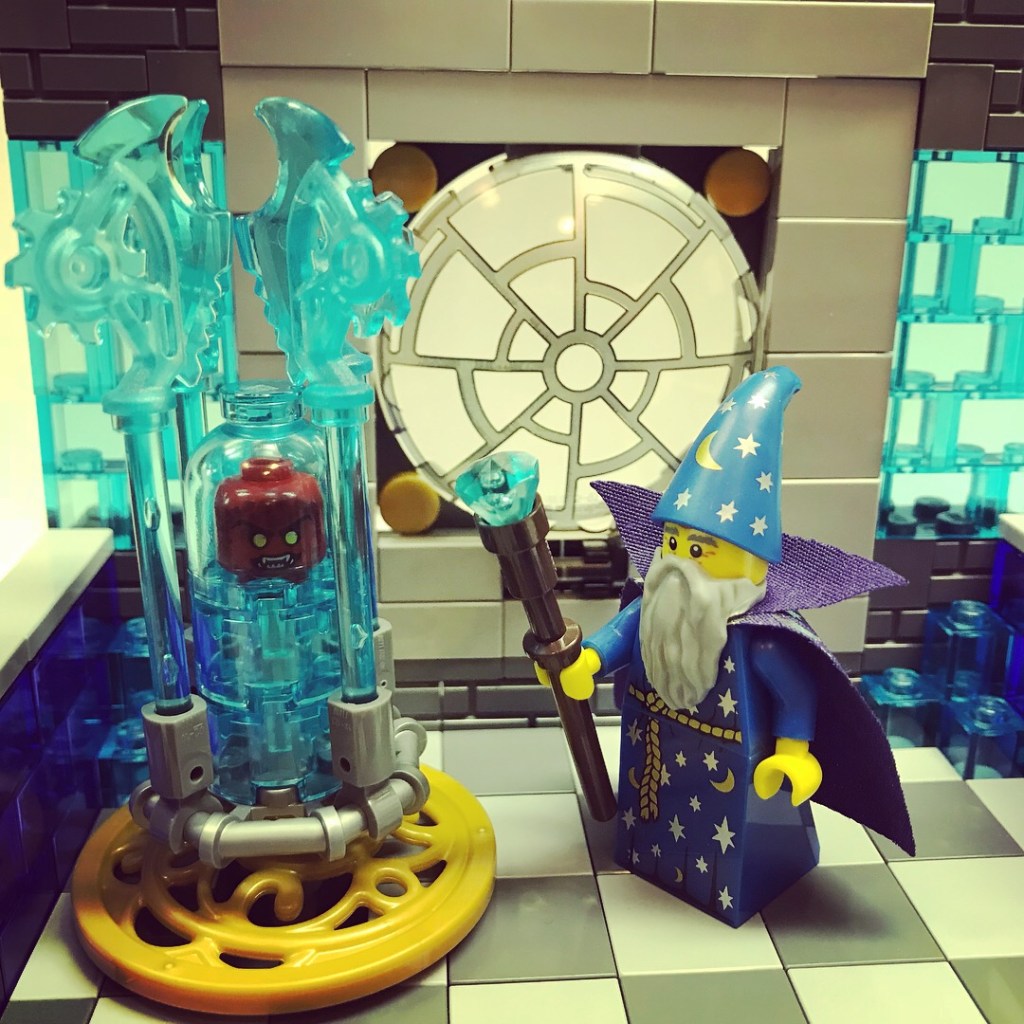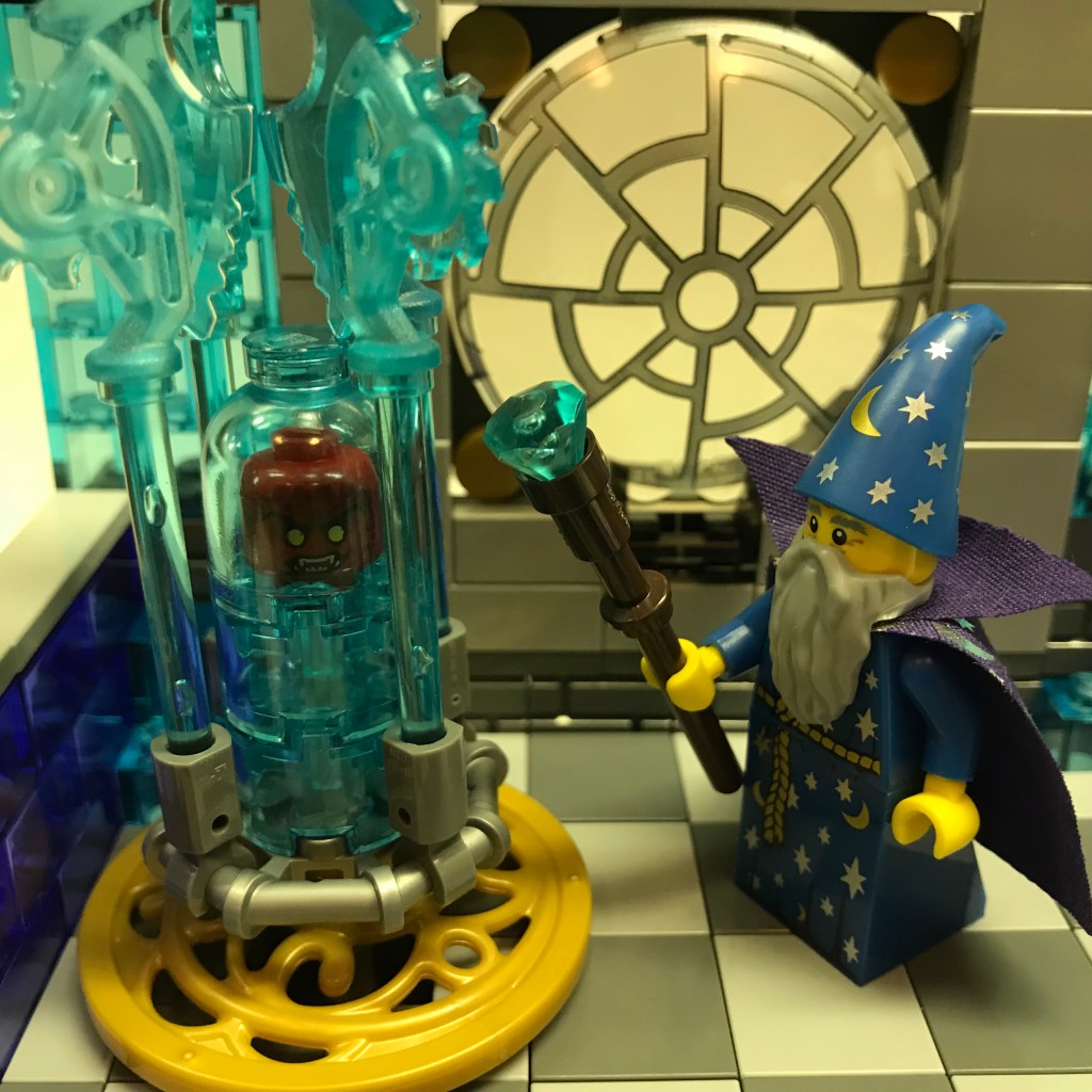 Here’s the counterpart to the Red Wizard scene. This is the Blue Wizard in his studio. Scroll down to see him consult the oracular demon head he keeps in a jar and stirring a new batch of potions while his imps hold the lid of the cauldron.