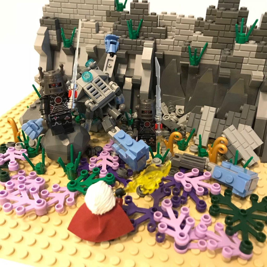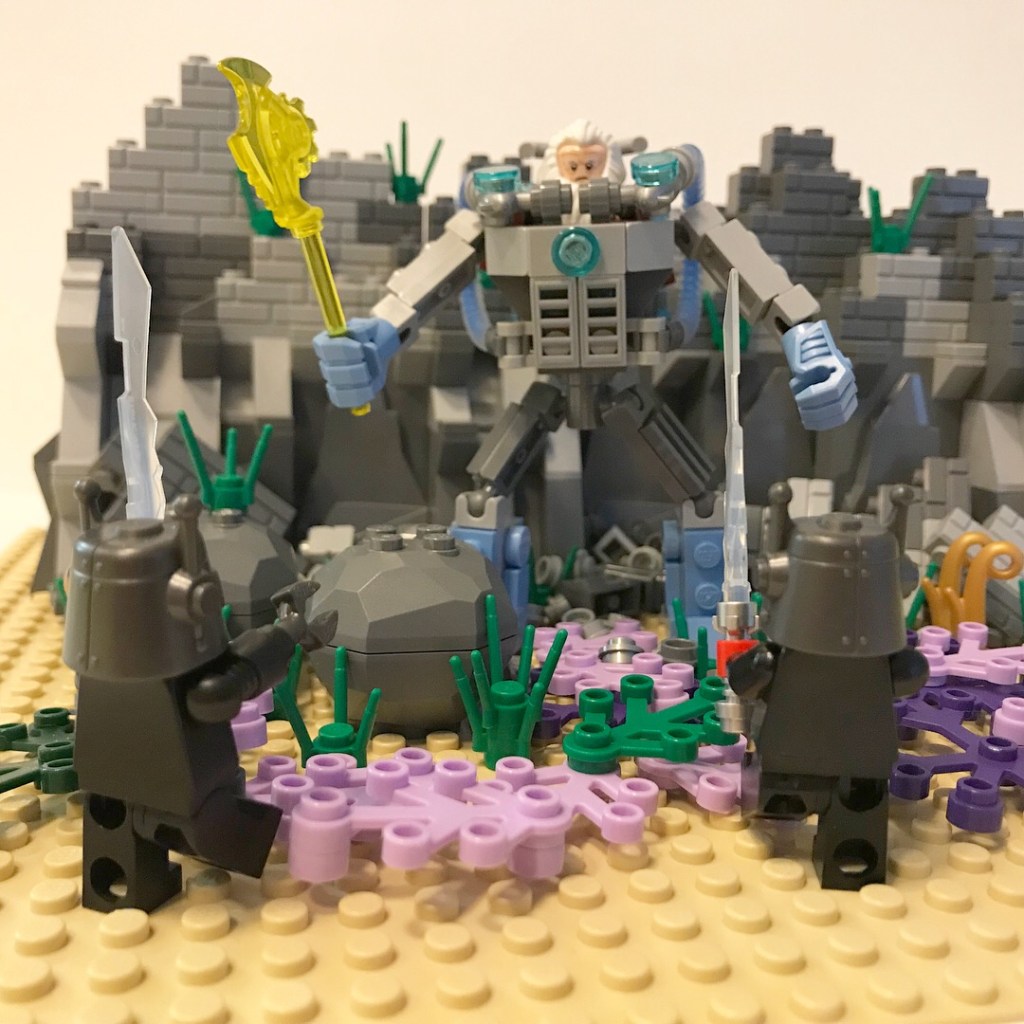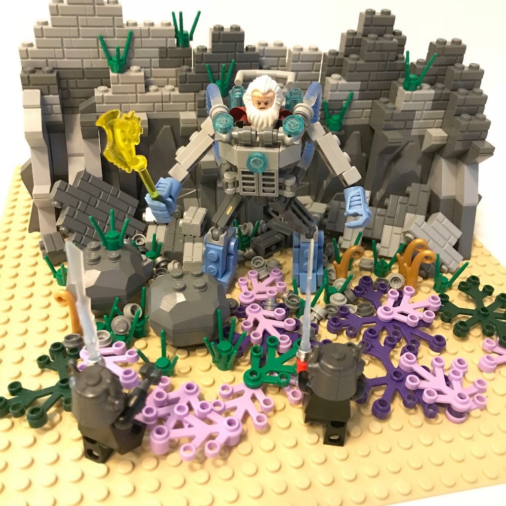 Tomb the Dwarf, armed with exo skeleton and power axe, faces off against the geteit chemosit in the ruins of the Afternoon Cultures.