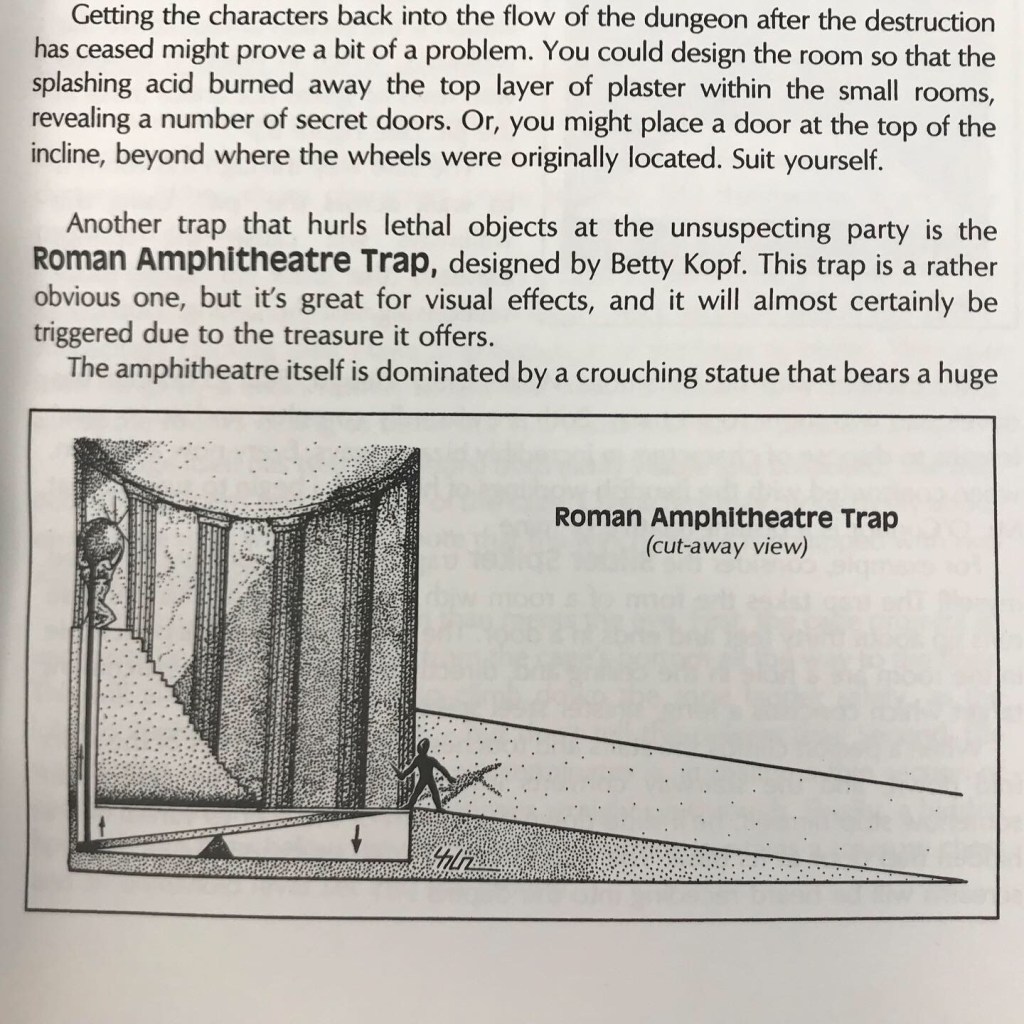 From page 3: The Roman Amphitheatre Trap, designed by Betty Kopf. “This trap is a rather obvious one, but it’s great for visual effects, and it will almost certainly be triggered due to the treasure it offers. The amphitheatre itself is dominated by a crouching statue that bears a huge golden globe upon its shoulders. The globe is roughly 5’ in diameter, weighs in the neighborhood of 5 tons, and is worth approximately 50,000 g.p. The amphitheatre’s floor is actually an enormous, finely-balanced lever. Whenever a weight is set upon the floor (such as a dungeon party), the lever will shift, causing the pole within the main amphitheatre structure to rise and dislodge the golden sphere. The ball will bounce down the steps and into the midst of the party.”