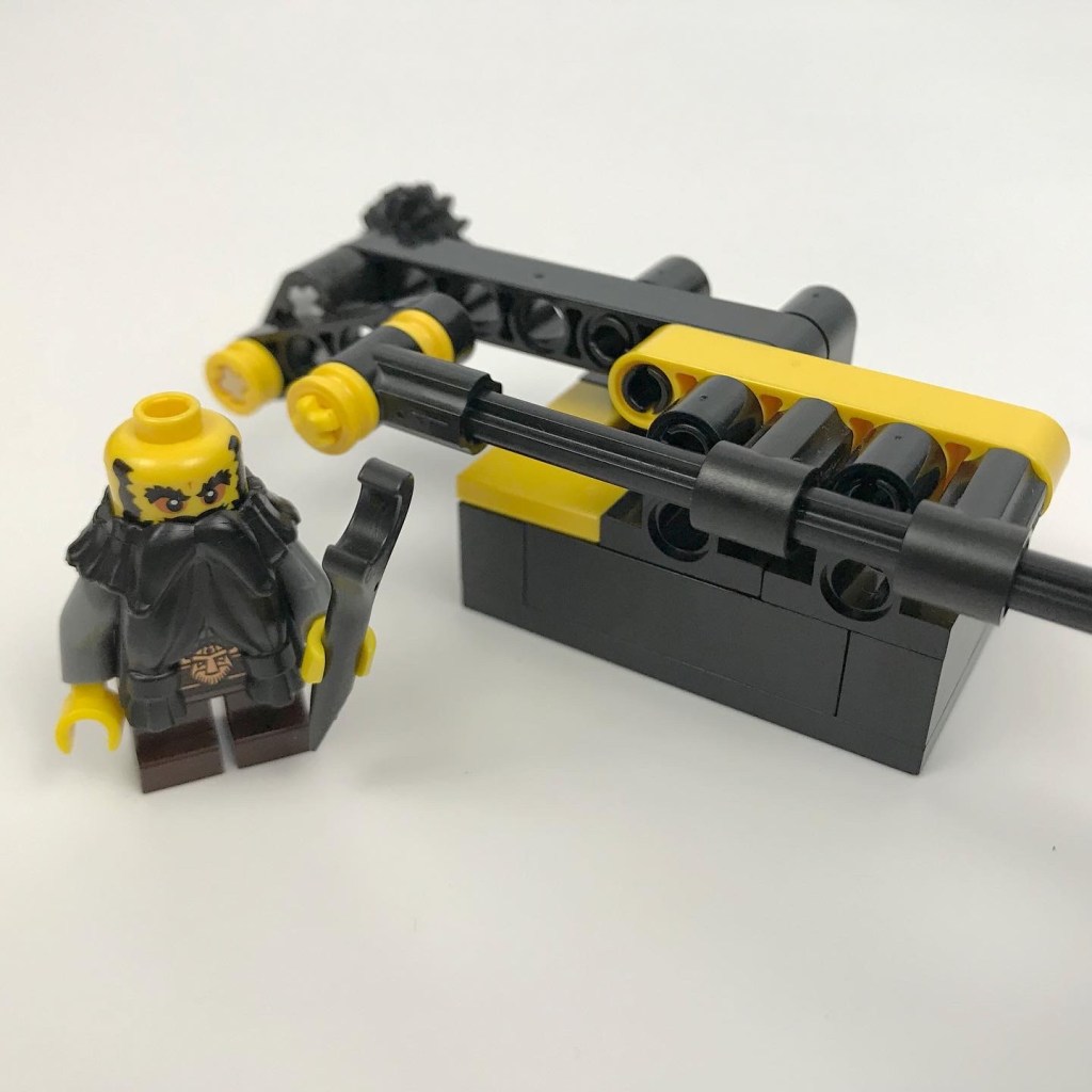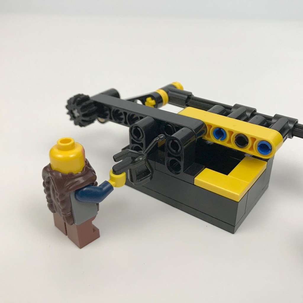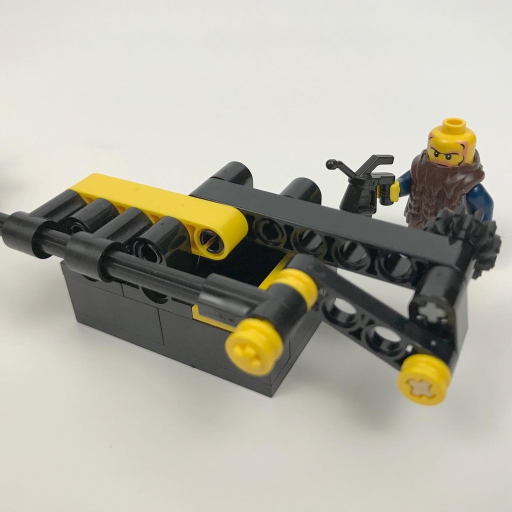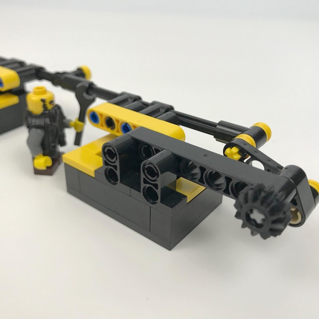 Here is the central mechanism of the Yellowjacket. The gears simply translate vertical motion (like that caused by pressing down on the pressure plate) into linear motion, and back again in the other direction (lifting the ‘stinger’ that dislodges the ball). The left and right sides of the Yellowjacket are mirrored versions of the same mechanism.