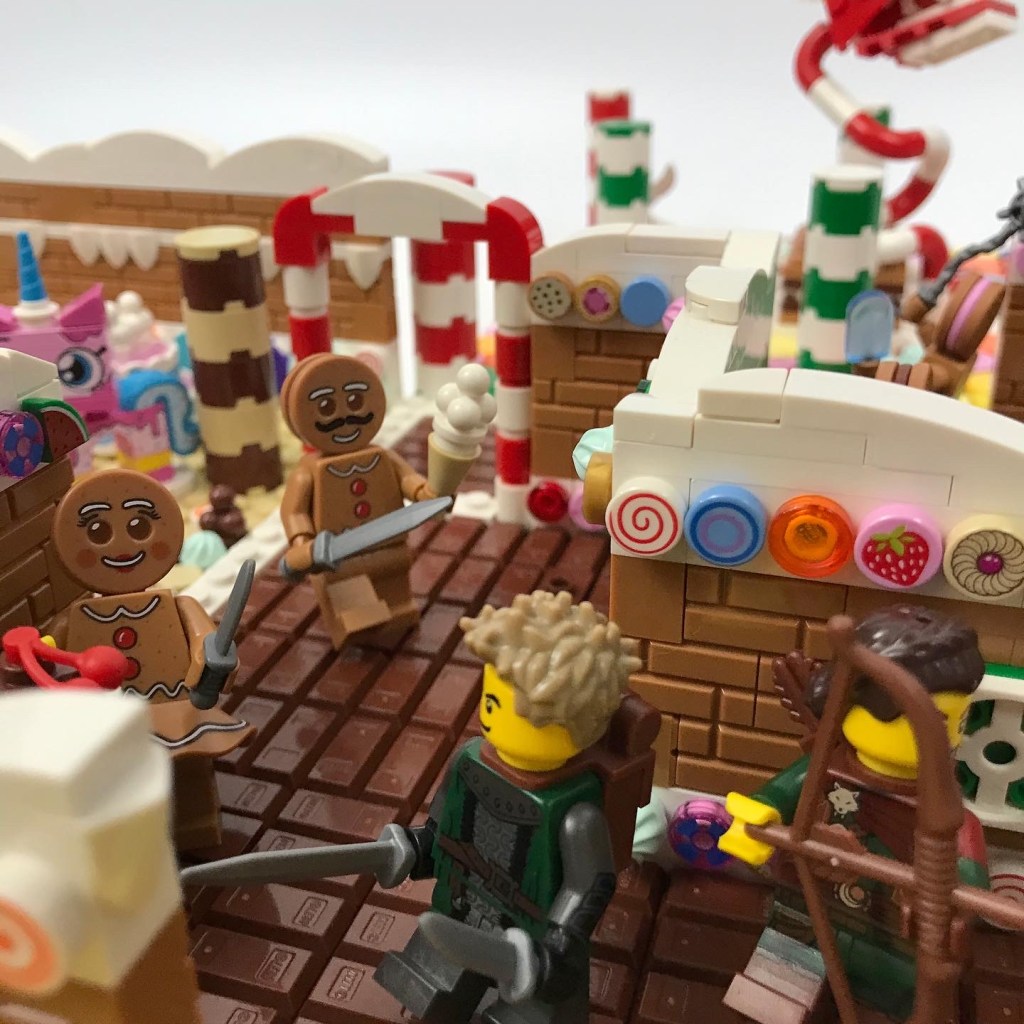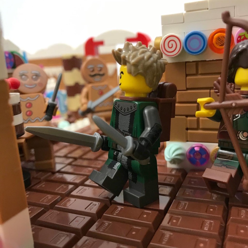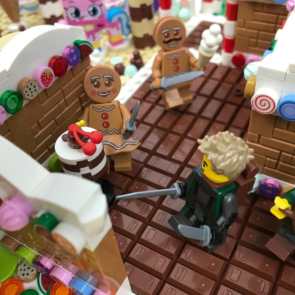 The gingerbread folk are hiding weapons behind their backs – a sword, an axe, a flail, even the sweet lady offering a forkful of cake has a dagger in her other hand!