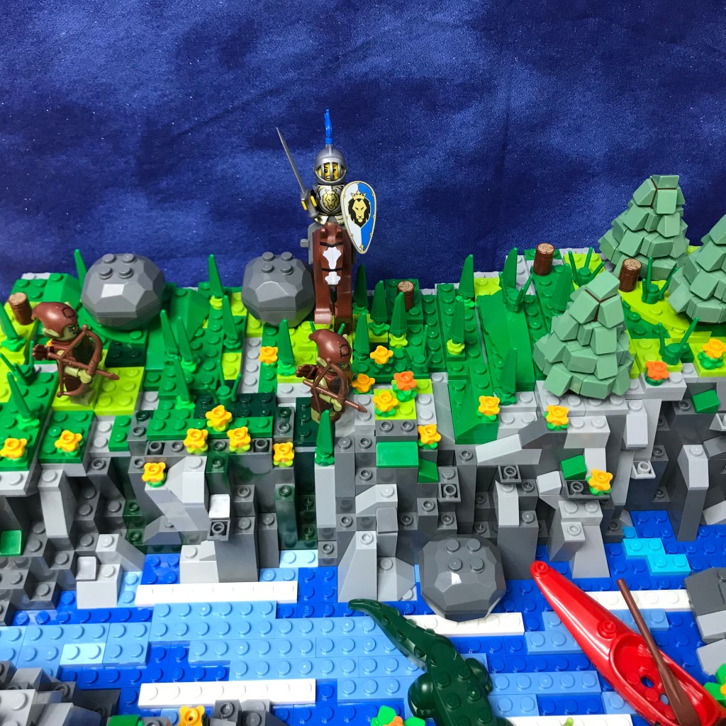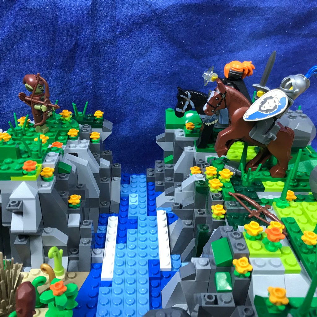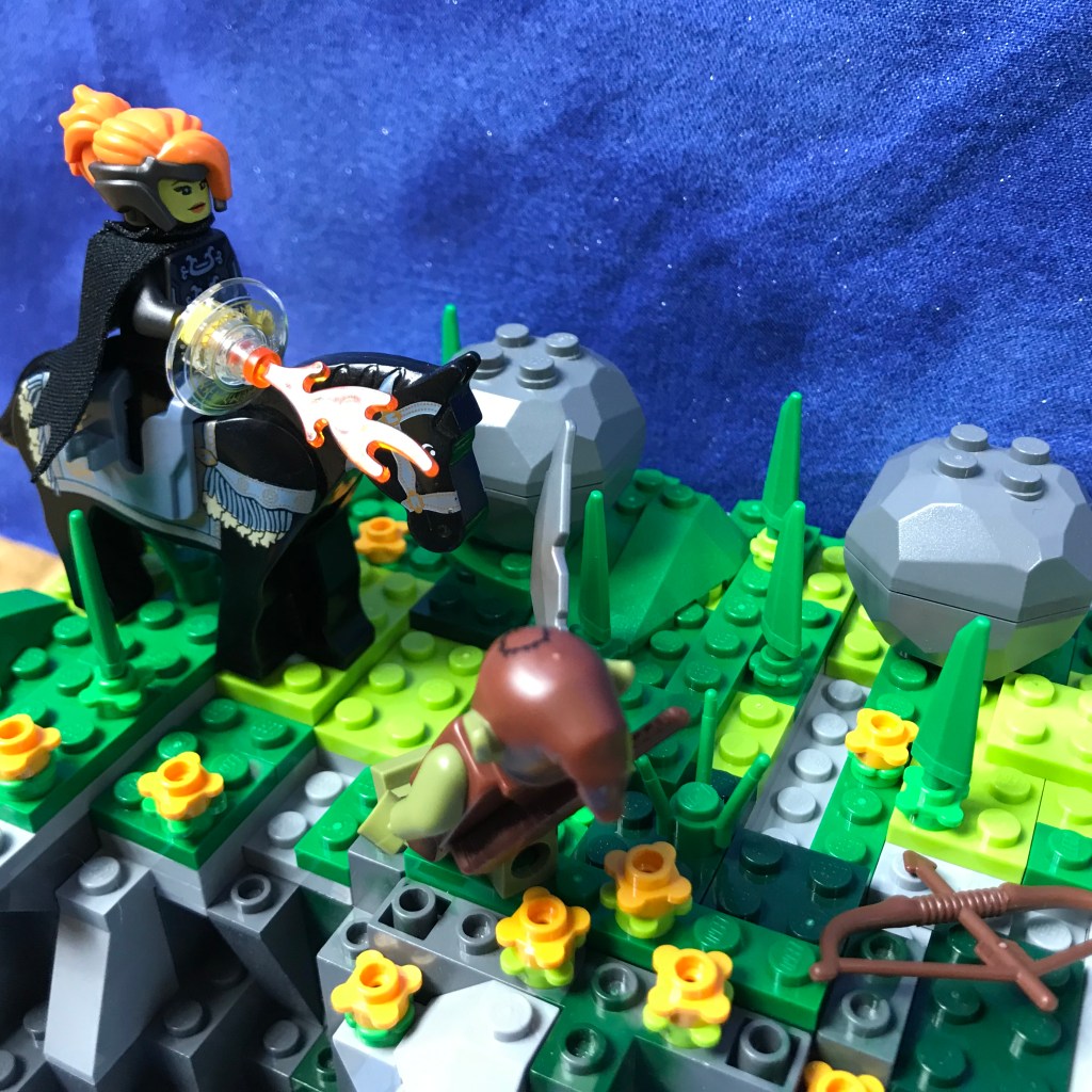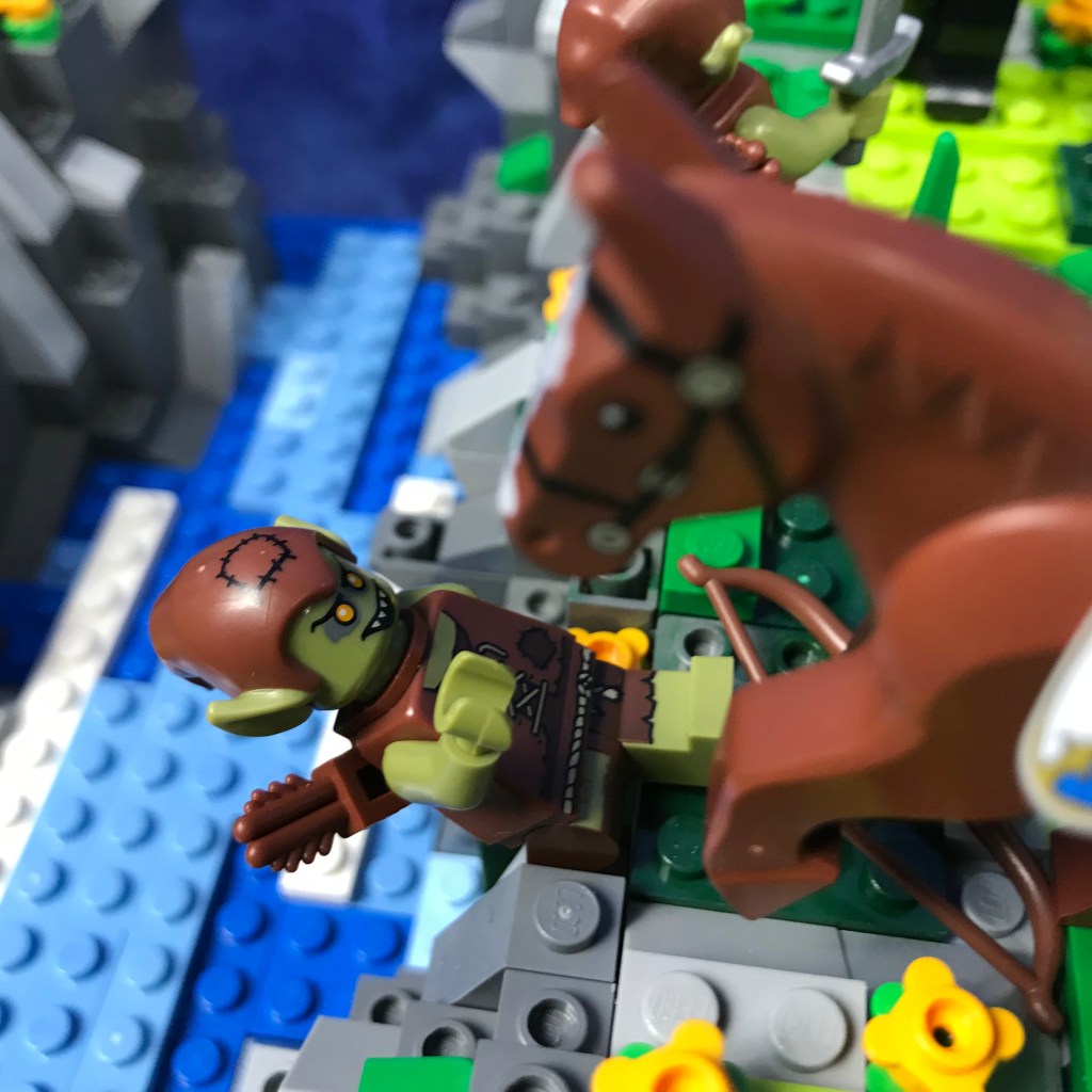 Ingrid surges forward on her mount, driving one of the Goblins off the edge of the cliff! It turns out Goblins can’t swim …