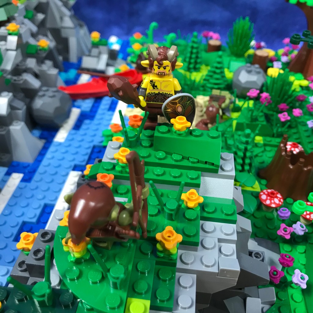 On the beach below, the crocodile transforms back into its true shape: the Druid Taddeo Oaksmith! Smilax draws his sling and aims for the Goblin archer. But Taddeo is too impatient for ranged combat; with a mighty leap he lands on the rock pile with the Goblin archer! With a swift blow from his club, the Goblin is unconscious. Taddeo tips the body into the river to join the rest.