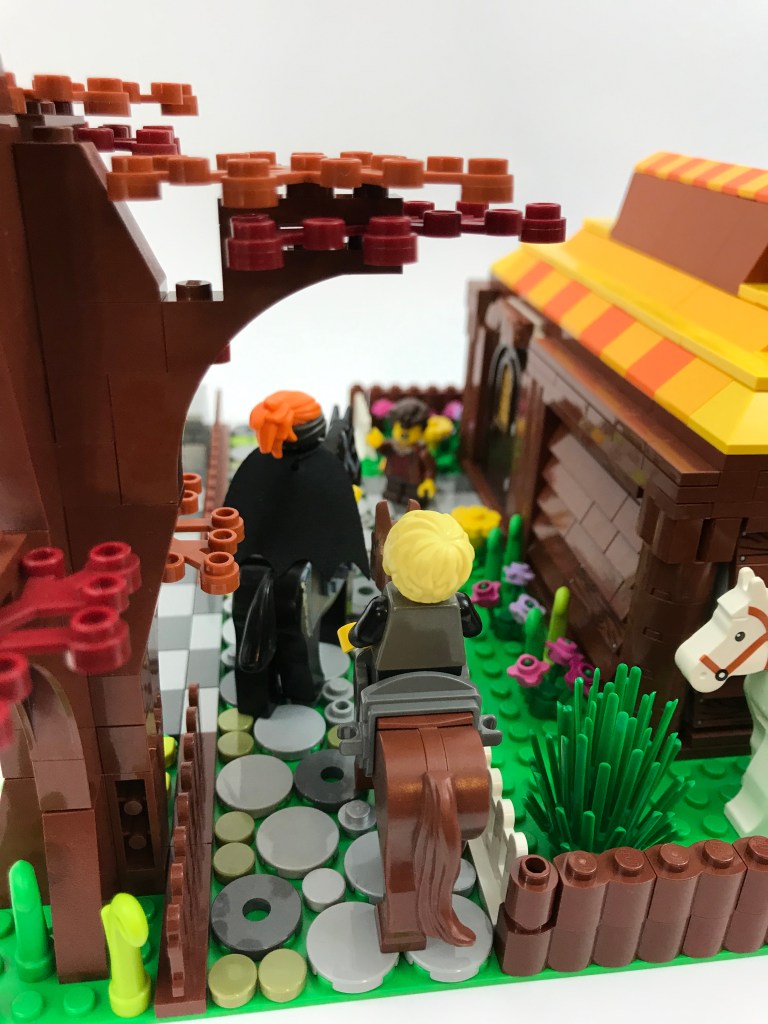 As they canter down the cobblestone lane past a pretty wooden cabin, the resident emerges and hails them. He is a dapper Halfling gent with a friendly smile.