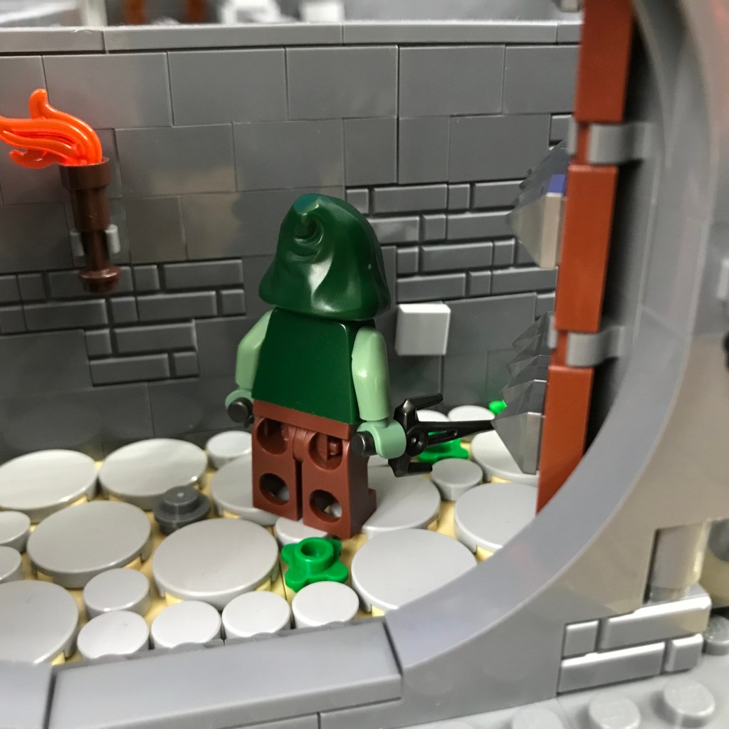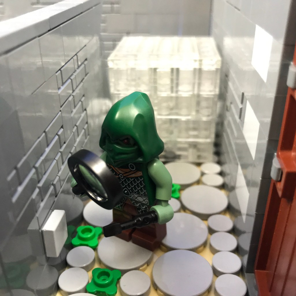 Smilax enters and examines a plate protruding from the wall, looking for traps.