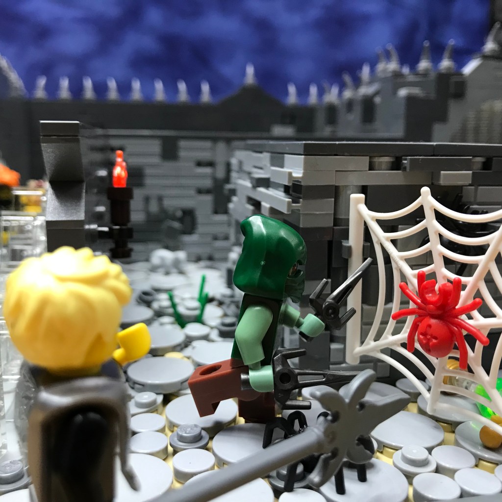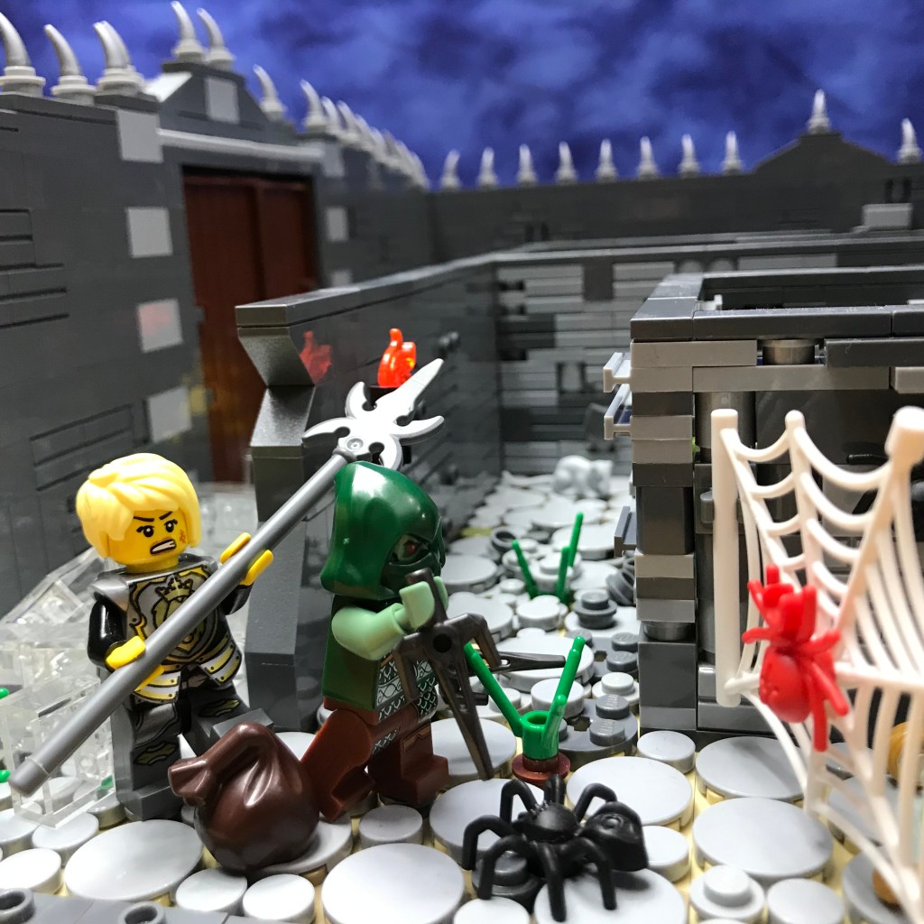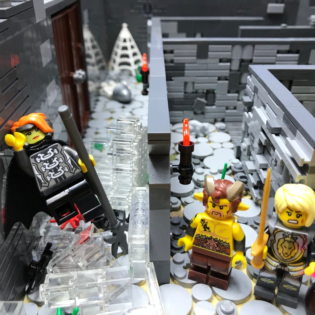 Smilax shows no fear of the Giant Spiders and rushes in, sais stabbing and slashing! The first two Giant Spiders fall dead, and Smilax severs their web from the wall. A third Giant Spider waits on the wall behind the web; it becomes easy prey for the long reach of Ingrid’s polearm.