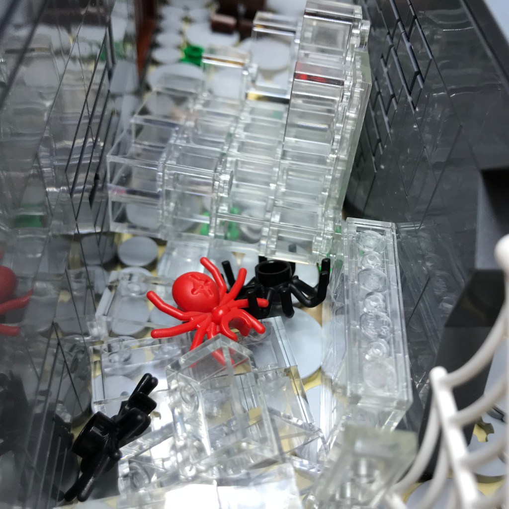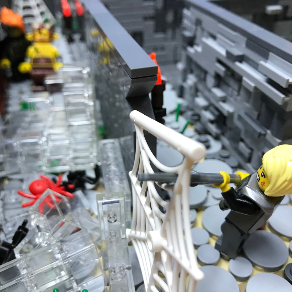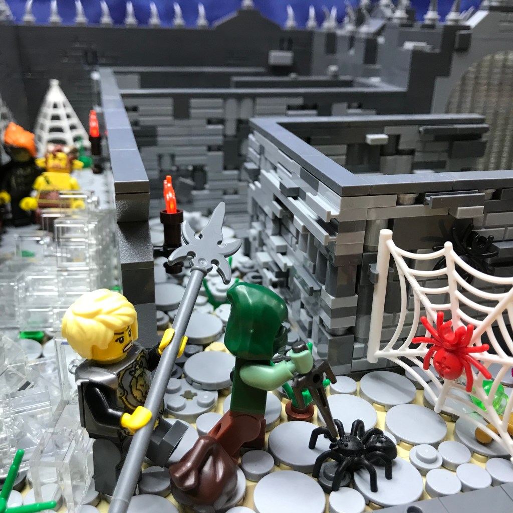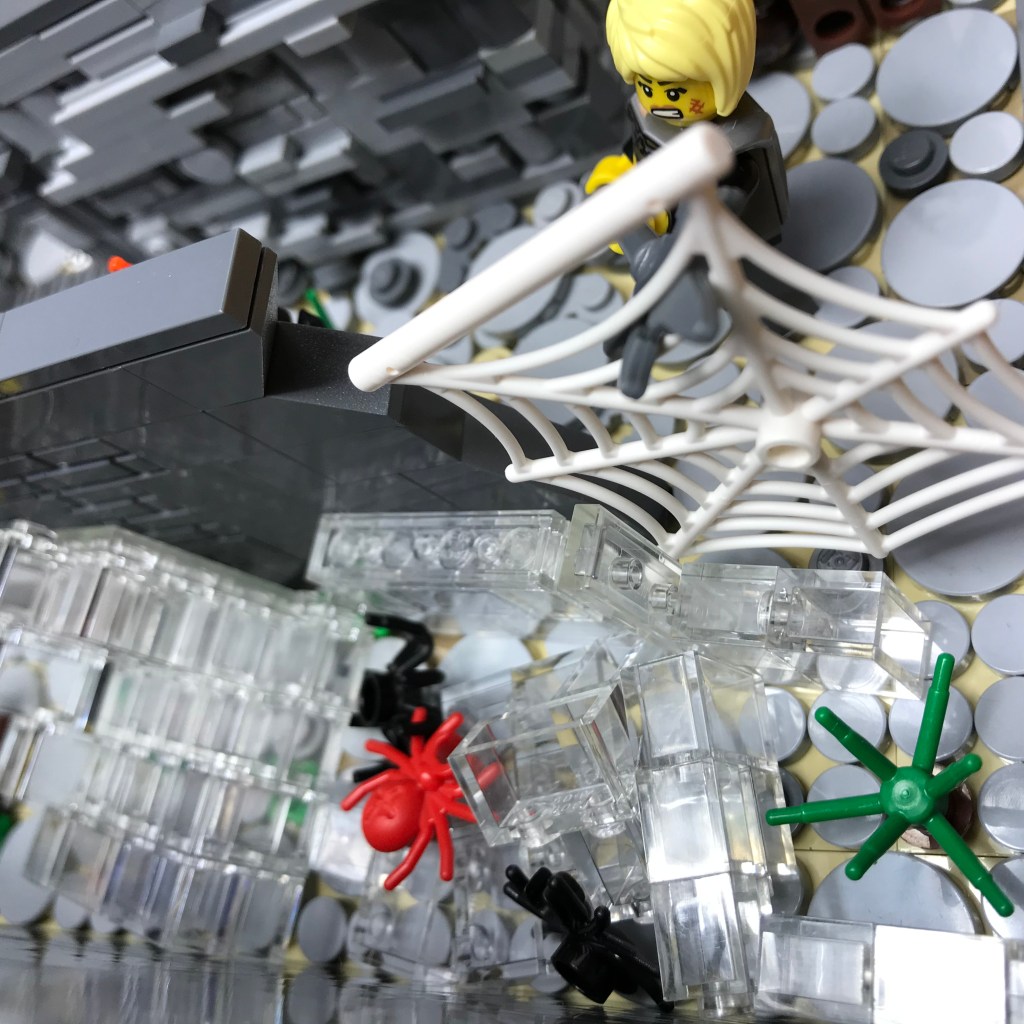 Smilax shows no fear of the Giant Spiders and rushes in, sais stabbing and slashing! The first two Giant Spiders fall dead, and Smilax severs their web from the wall. A third Giant Spider waits on the wall behind the web; it becomes easy prey for the long reach of Ingrid’s polearm.