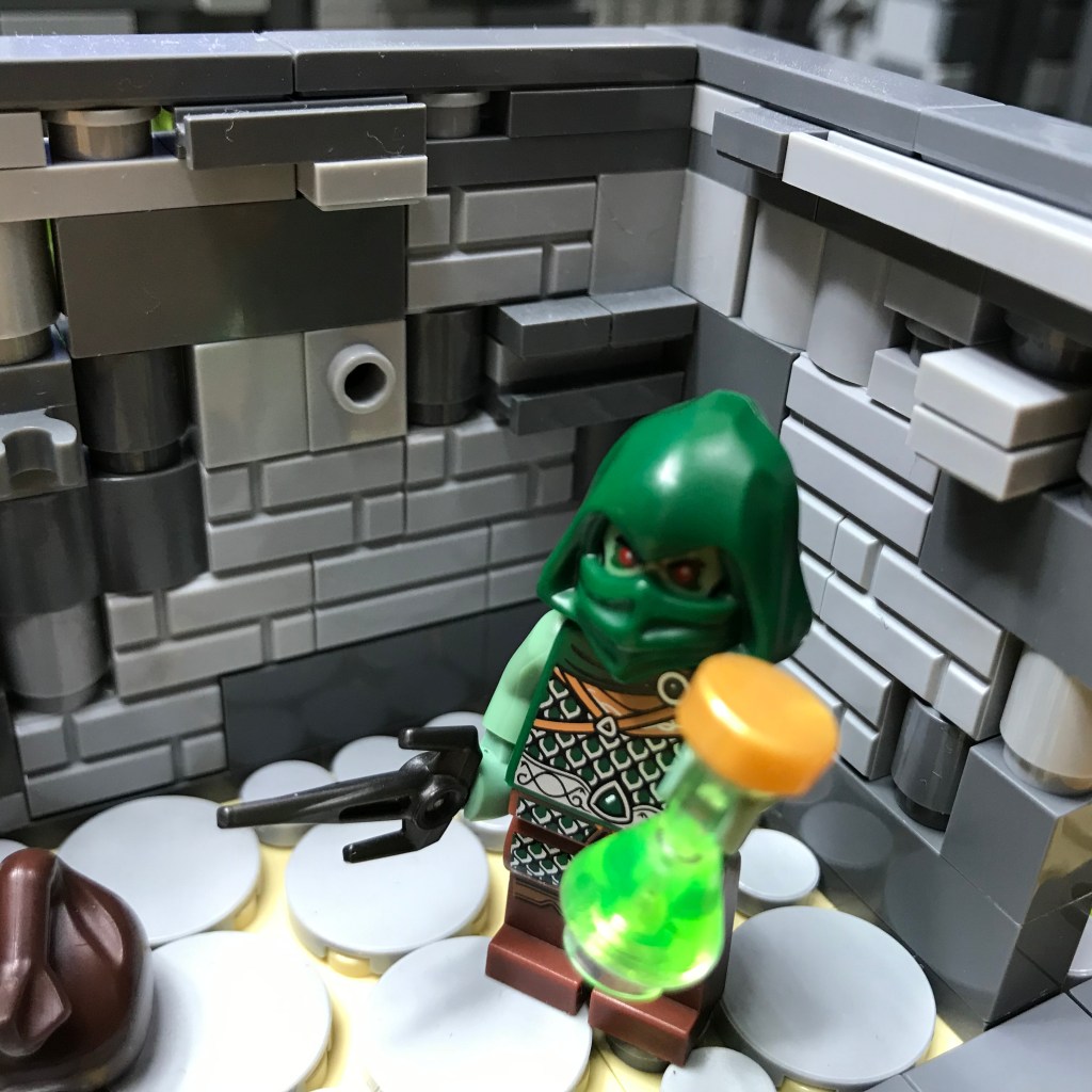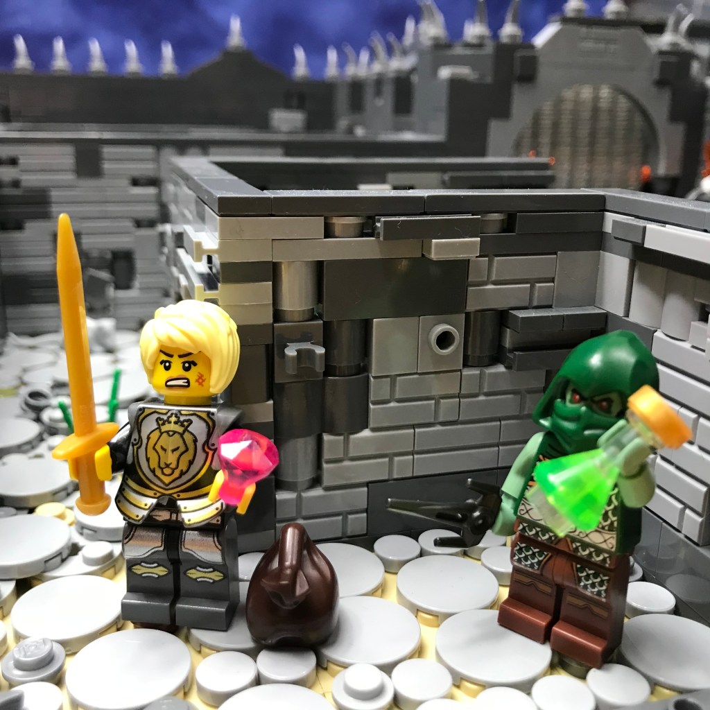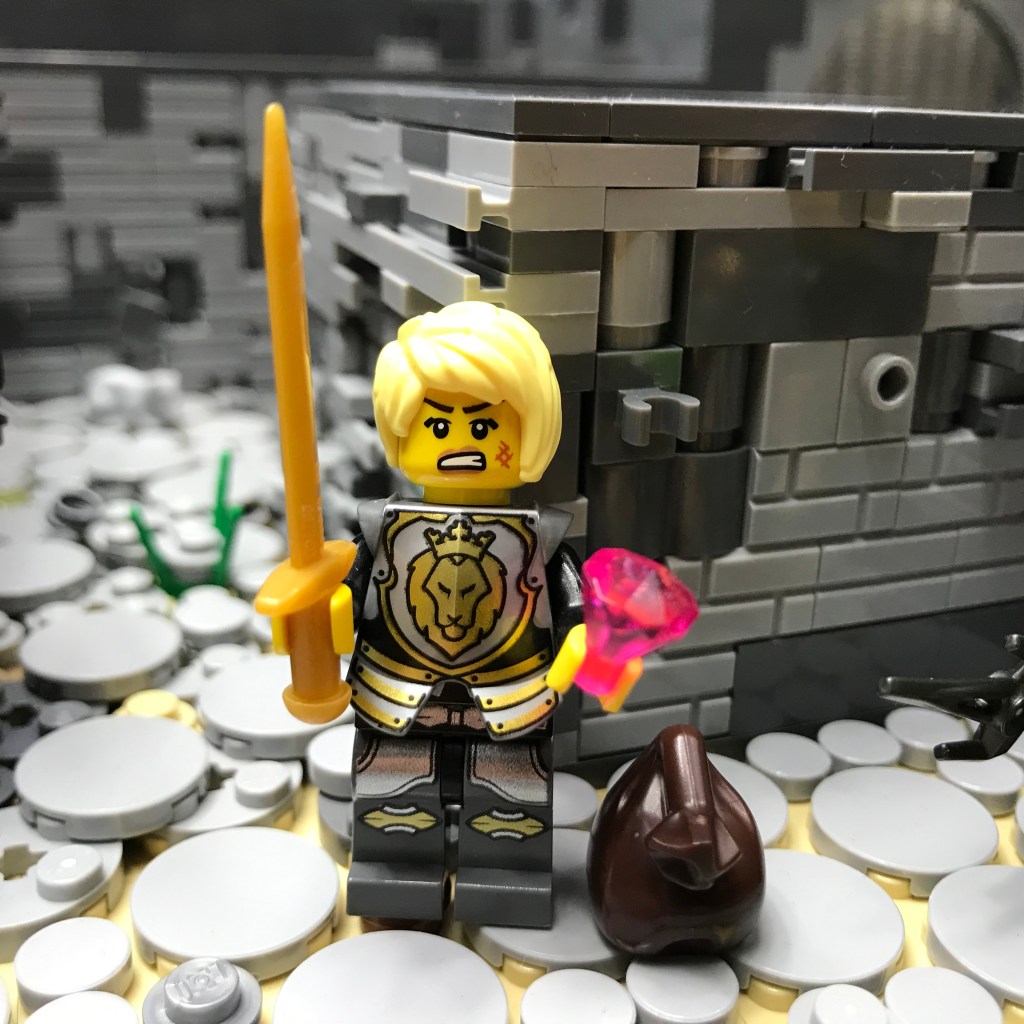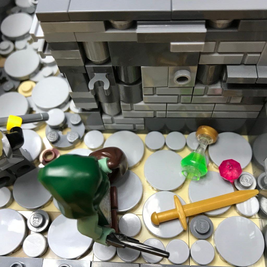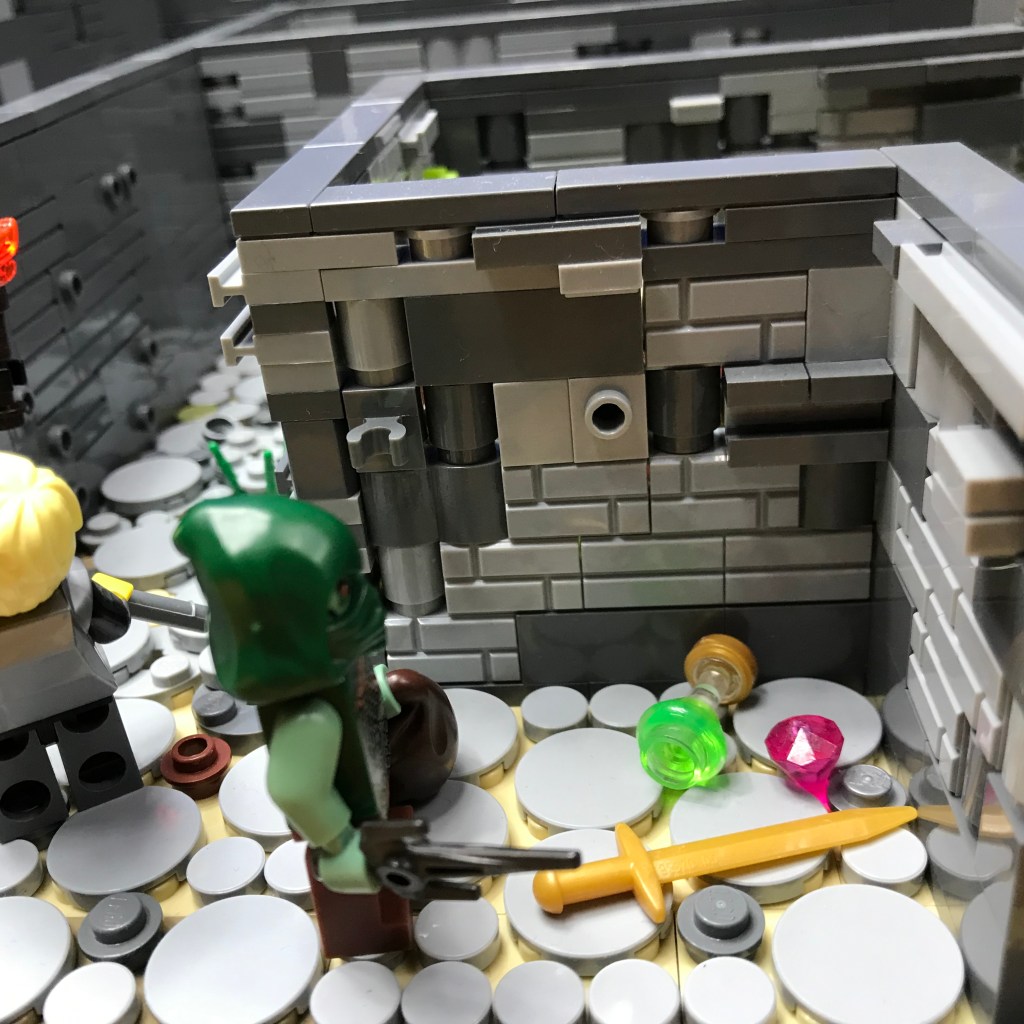 Meanwhile, Smilax has discovered treasure! The web of the Giant Spiders concealed a dead end in the corridor, as well as a shining ruby, a glistening golden sword, and a mysterious green potion.